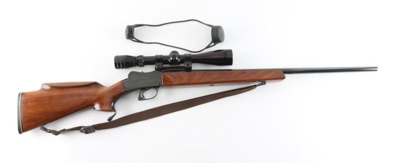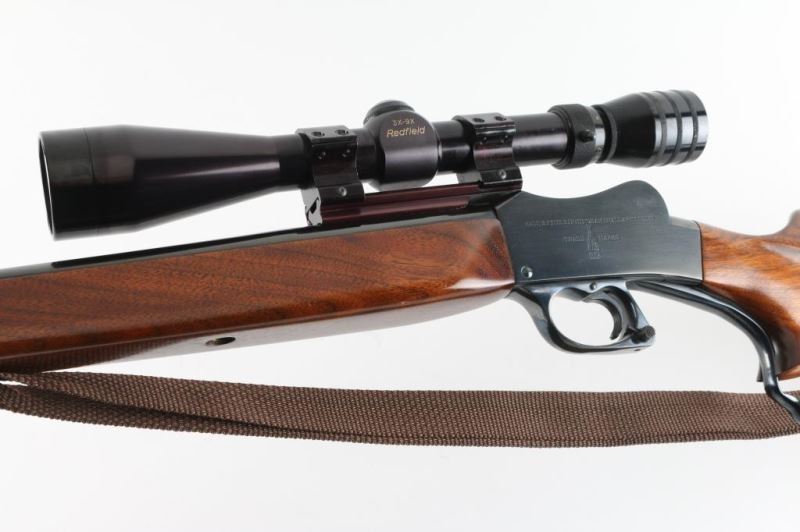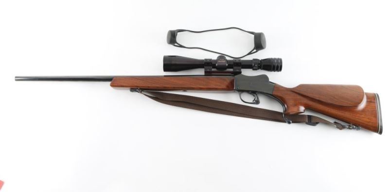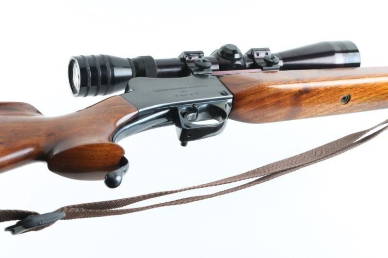 British made single shot rifle with lever operated tilting block action. Features blued finish, wide smooth wood forend, curved grip wood shoulder stock with right hand cheekpiece, solid thin rubber butt pad, 24.5" custom barrel, weaver type scope base on barrel, cocking indicator, push button safety in reshaped or aftermarket replaced triggerguard, sling studs. Bore appears very good. Retains 80% finish, appears reblued, with some blemishes and patina to receiver sides. Wood is very good condition with good figure. Marked "Commonwealth of Australia", "21252", "3MD", kangaroo emblem on receiver. Serial number on receiver & barrel. Mounts a very good condition Redfield 3-9x scope. Includes nylon sling with quick detach swivels. Condition is NRA Very Good+ (as refinished) *** C&R Firearm ***
