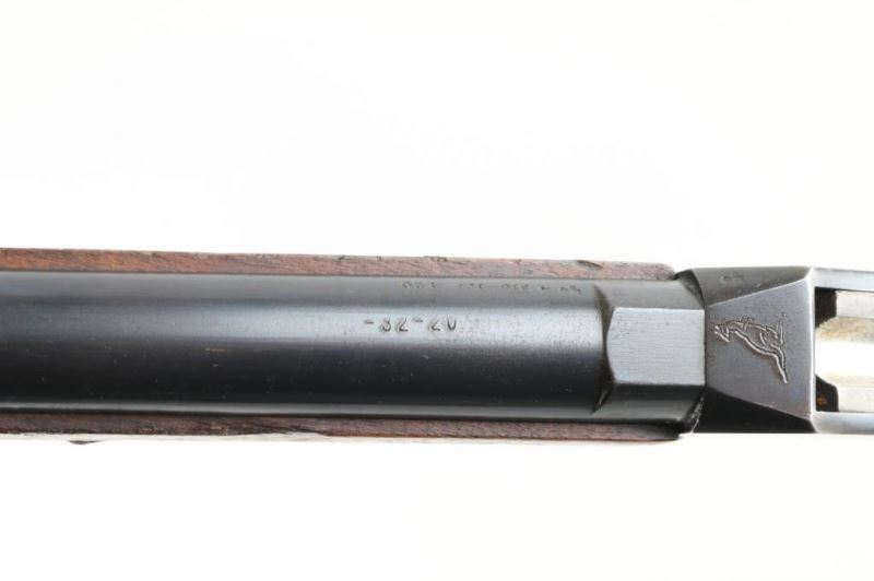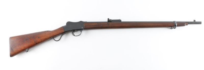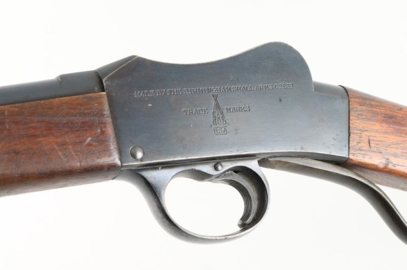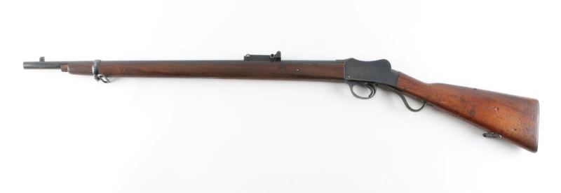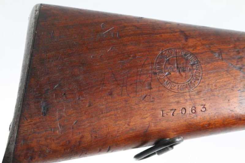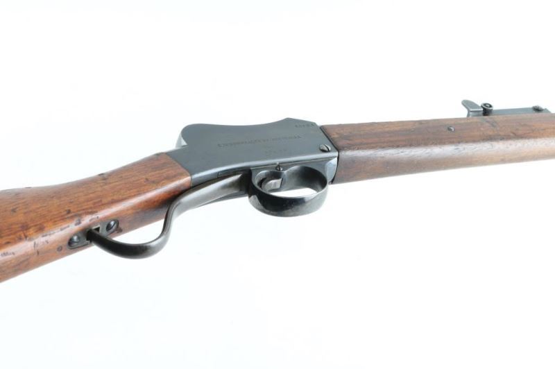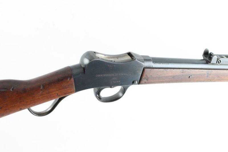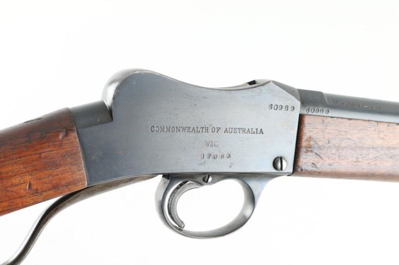 British made single shot rifle with lever operated tilting block action. Features blued finish, long military style wood forend, straight gripped wood shoulder stock, smooth metal buttplate, 25" barrel, sling swivels, blade front sight, tangent rear sight, cocking indicator. Bore appears very good. Retains 75% blued finish, turning brown in places, patina on receiver sides, edge losses, cleaned area near front sight. Bright metal breechblock and case color finished lever are good condition. Wood is good condition, appears original, with many dents and scratches, clear sharp cartouche on butt.. Marked "Commonwealth of Australia", "17063", and "VIC" on receiver, kangaroo emblem on receiver ring. Serial number on receiver & barrel. Original caliber markings remain, "32-20" added over breech. Condition is NRA Very Good+ *** C&R Firearm ***
