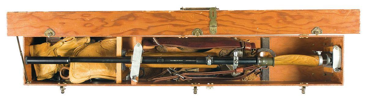 Fitted with a set of Al Freeland tube globe and peep sights, floating crowned barrel, forearm with mounting rail, pistol grip with custom thumb rest and hand rest, raised cheekpiece and adjustable freeland buttplate. In a home made wood case with a Swiss-hook buttplate, palm rests, shooting gloves and other accessories.