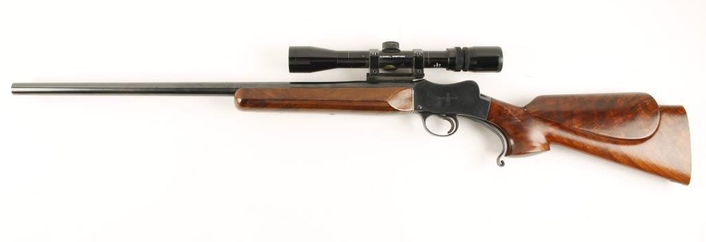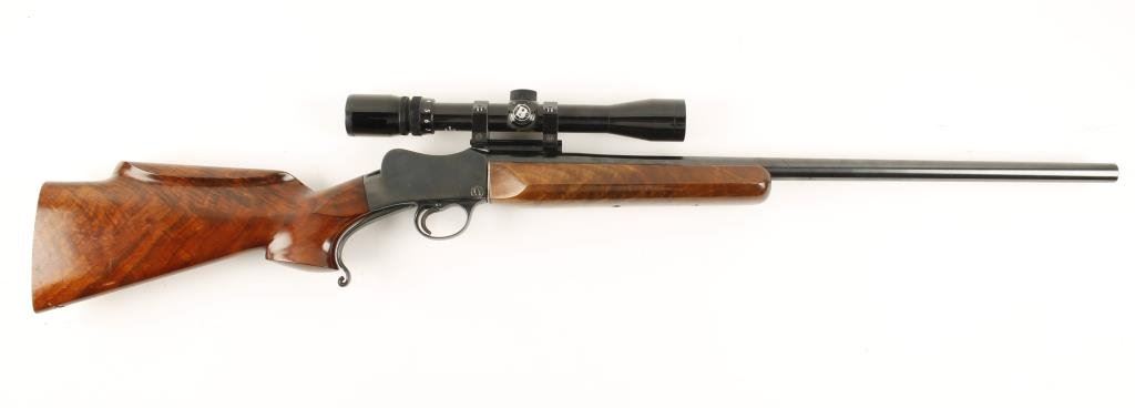 BSA Martini action single shot rifle, .22 Hornet cal., 23” round barrel, re-blued finish, deluxe re-stocked target stocks, #2547, mounted with a Bushnell Sportview 3X-9X scope with crisp optics. This gun is in overall good condition as finely re-finished and professionally re-stocked; very good bore, crisp action, excellent graining to wood, missing butt plate; desirable caliber. Est.: $350-$700.
