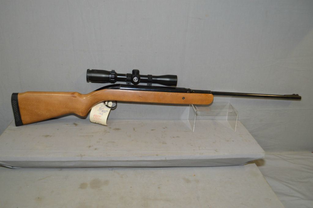 BSA Model Airsporter .177 Pellet Cal Spring Loaded Single Shot Pellet Rifle w/ 18 1/2" bbl [ blued finish, part of front sight & back barrel sight removed, but fitted w/Bushnell 3 x 9 scope, in rings, in integral base groove, pistol grip stock w/raised cheek piece, note : left hand side cut for peep sight, has BSA recoil pad ] Ser # 6171418 PAL REQ