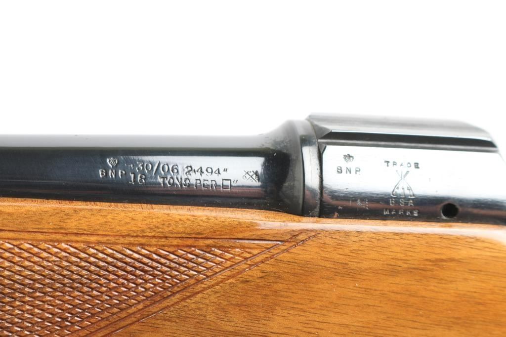 British made deluxe sporting rifle. High polished blue bolt-action rifle with a 22" barrel, ramped, hooded. post/bead, and adjustable flip, u-notch rear sights, manual safety, integral scope bases, wood stock, hinged floorplate, adjustable serrated trigger, factory recoil pad, wood stock with checkered forearm, and wrist, contrasting dark walnut forend, and grip cap, sling swivels. Blued finish is about 98% Bore is bright and shiny with sharp rifling. Action is working well. Blonde colored stock has sharp checkering panels, a couple of very minor dings, Polished bolt has 5 gold star engraved on it. NRA Condition-Excellent. Modern Firearm.