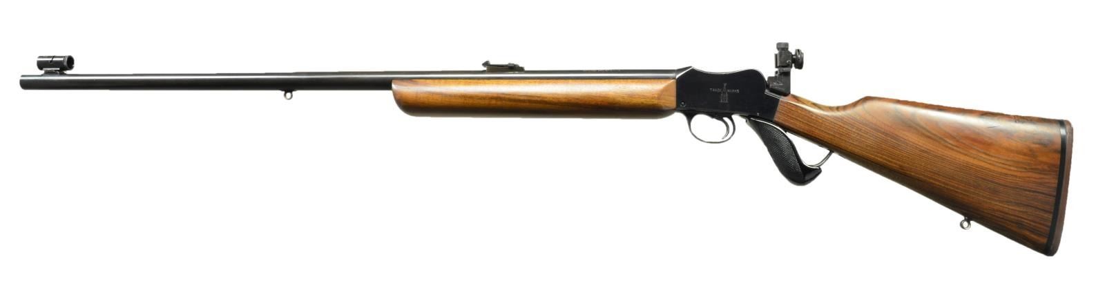 Cal. 22 LR. S# 42906. Bbl. 29" w/ sling base on bottom. Muzzle is stamped w/ "Parker Hale AGP". Parker Hale FS 21 globe front sight, matching numbered 200m tangent rear sight & Parker-Hale Model 7 aperture receiver sight. Martini style action w/ Parker-Hale style 10 rd. cartridge block on right side & added black composite checkered pistol grip on lever. Walnut beavertail forearm & straight grip stock w/ Old English pad. CONDITION: very good blue w/ minimal marks, patina & pinprick oxidation. Very good stock finish w/ light handling marks. Left side of buttstock has evidence of prior imperfections that equate to minimal wood grain checks & knot. Near excellent bore. (22-2349/MD). CURIO. $300-500.