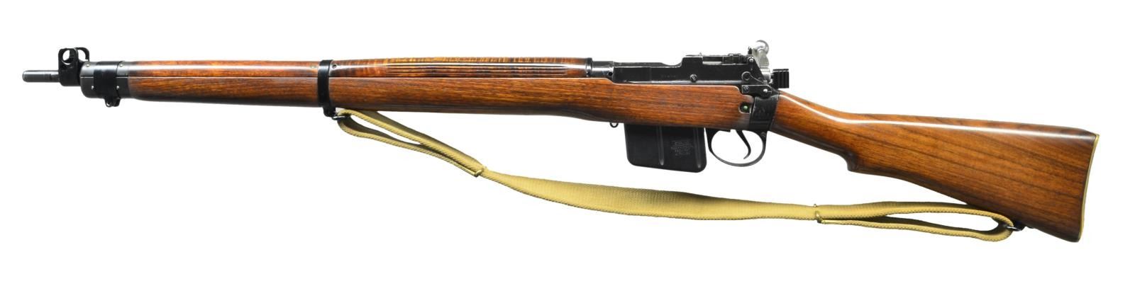 Cal. 7.62 NATO. S #13107. Bolt S # is mismatched, other parts unnumbered. Bbl. 25.2". This rifle appears to be a standard British No. 4 Mk. 1 with a Sterling kit converted to 7.62 NATO. The larger extractor and Sterling marked magazine are present but it retains the original 303 charger guide and floorplate w/out sling swivel. The rifle will feed and extract a 7.62 NATO round properly. The left side of the receiver lacks Sterling markings but it is marked "No. 4 MkI". The left socket is dated 1943 and marked w/ the # S. Top of the receiver is marked "ENGLAND". The ladder rear sight is graduated to 1300 yards. Front blade sight w/ protectors. Bottom mounted sling swivels w/ canvas 1943 dated SMLE sling. Walnut stock. CONDITION: refinished stock w/ added varnish and some handling marks. Metal retains 85% arsenal black paint and reworked blue with the bolt body being a silver pewter, scattered flaking and handling marks. Bright excellent bore. (22-2528/MJC). CURIO. $200-400.