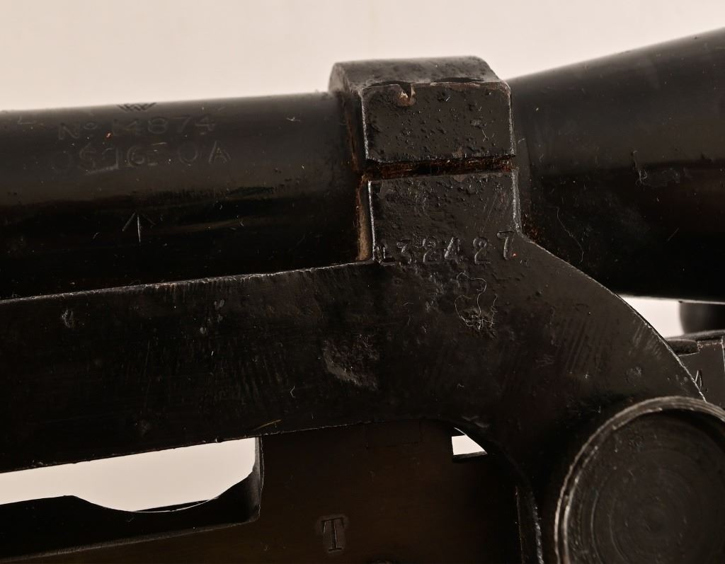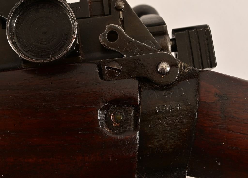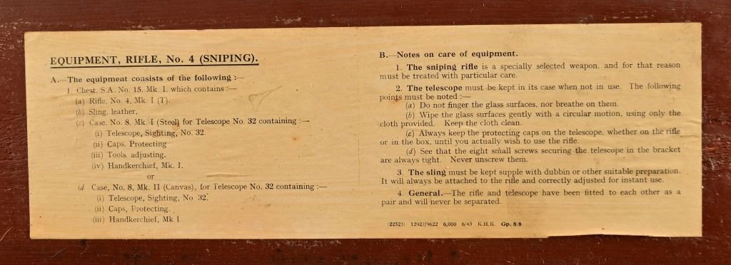 S/N L32427, manufactured 1944. WWII British sniper rifle with original No. 32 MKII scope & No.4 wooden transit chest. Barrel measures 25", raised cheek-piece on buttstock. Good action and bore. Modern.