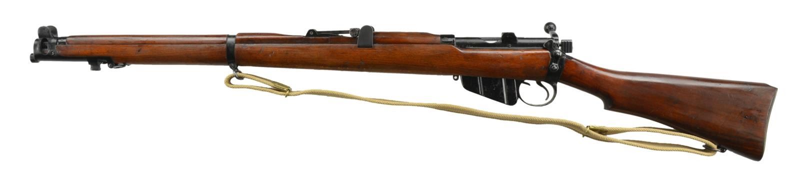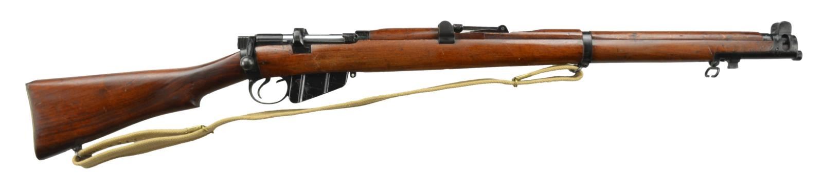 Cal. 22 LR. S# R55868. Bbl. 25 1/2" w/ "-015" marked protected front sight plus matching numbered 2-20 marked tangent rear. FTR 1954 marked receiver w/ matching numbered bolt & nose cap having stacking swivel. Right side of socket has BSA & 1954. Varnished hard wood stock set w/ matching numbered forend; buttstock w/ numerous proofs behind trigger guard & brass trap door buttplate. Black enamel finish on metal parts; "22" on bolt head. Tan canvas sling (brass ends) marked "J. & A. H. 1944" along w/ broad arrow proof. MAGS: 1 correct empty shell to catch spent 22 LR casings. CONDITION: about very good appearance w/ black enamel finish on metal parts plus extra varnish on wood. Numerous light handling marks throughout. Near excellent sling & bore. PROVENANCE: from the estate collections of Charles P. Obremski. (22-1255/NW). CURIO. $500-750.