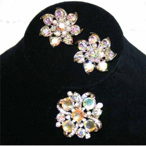 Tons of fire and sparkling in this gorgeous vintage signed BSK Brooch & Earrings set created in the 1950s. Chaton Aurora Borealis Rhinestones created in pin wheel fashion and set in a beautiful gold plated metal. The Brooch is outlined with Pava Rhinestones measuring 1 ½ inch in diameter. The Earrings repeat the same motif measuring 1 ¼ of an inch in diameter. Earrings are signed BSK and the Brooch is unsigned.