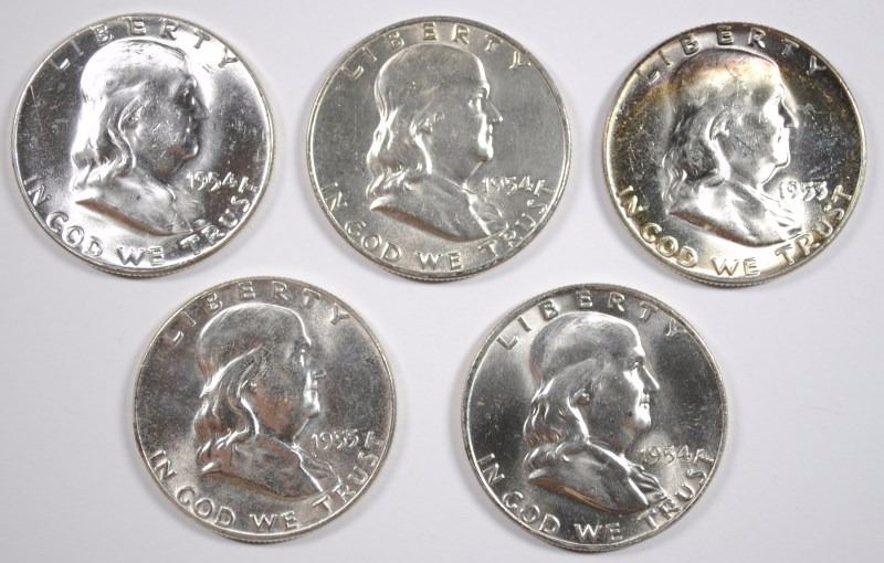 BU FRANKLIN HALF DOLLARS, 1953, 1954, (2) 1954-D & 1955