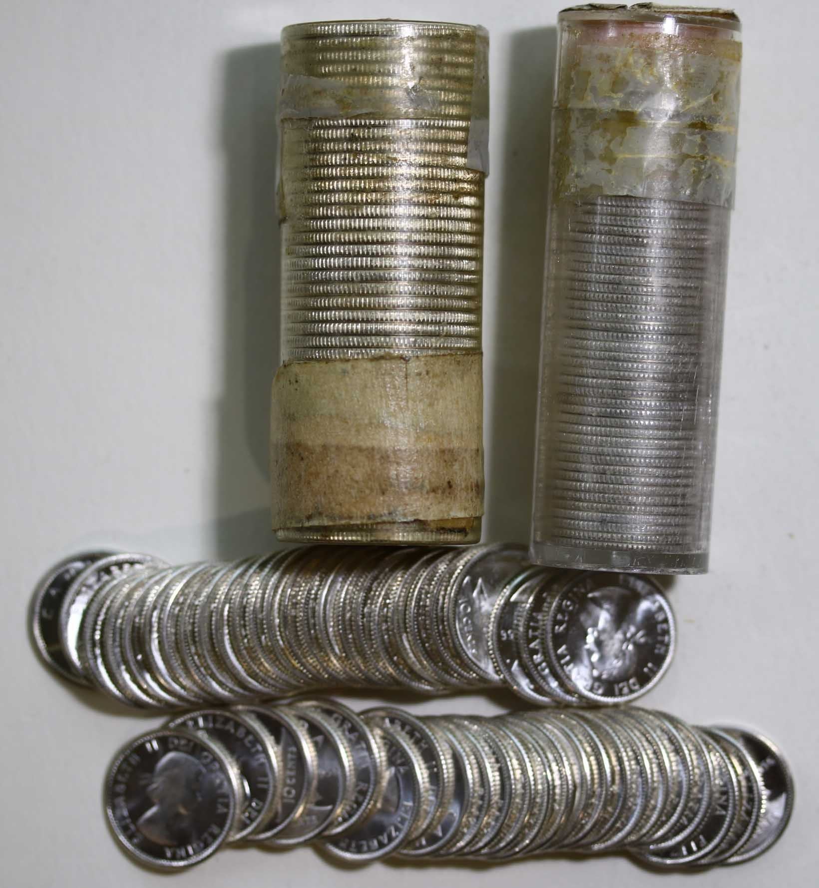 BU Rolls; Silver 1956 10¢ (2) & 1956 25¢ UNC to BU rolls. Lot of 3 rolls in plastic tubes. Unsearched by TCNC.