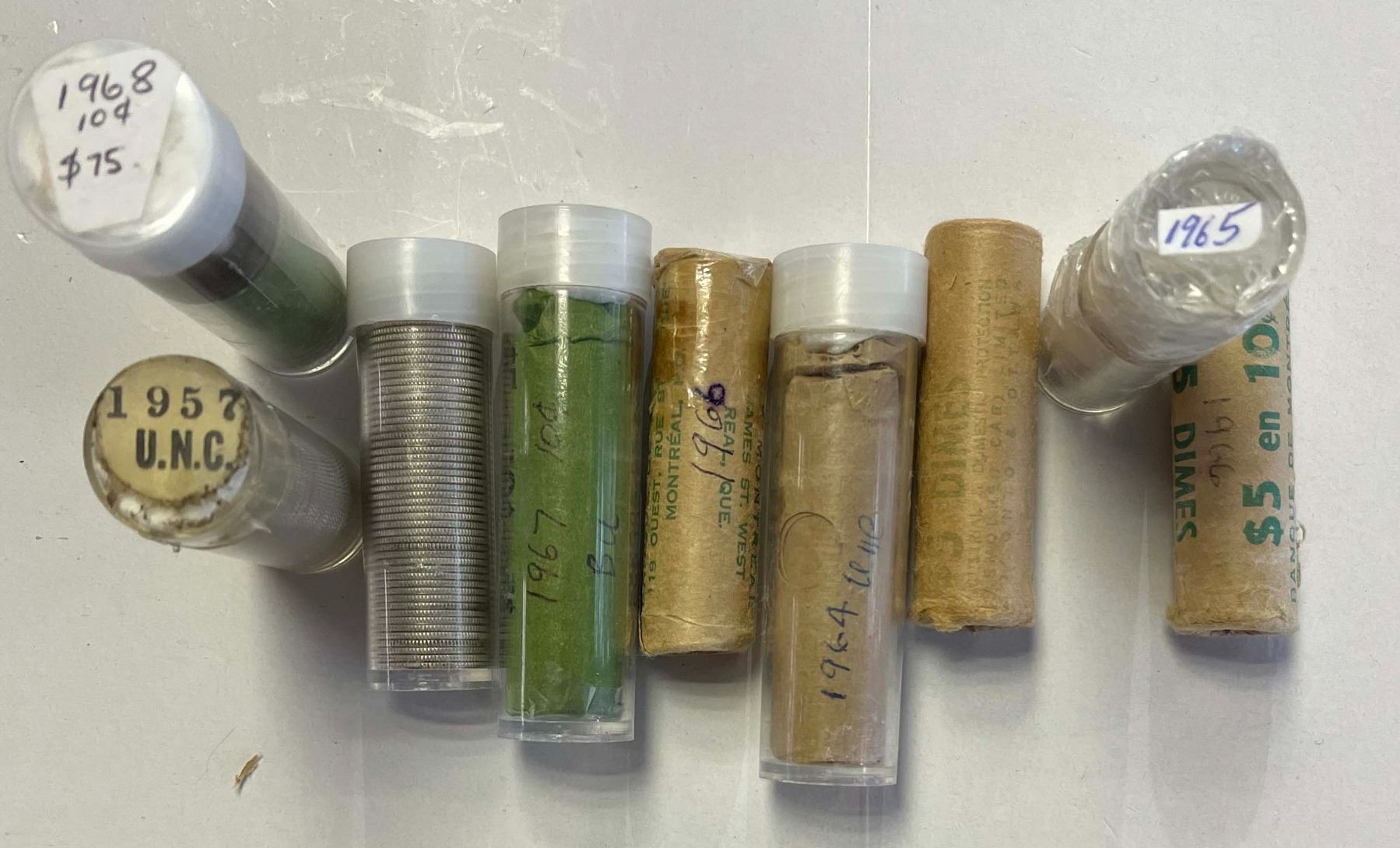 BU Rolls; Silver 1956 10¢ (2), 1964, 1965, 1966 (2), 1967 (2) & 1968. Lot of 9 UNC to BU rolls (3 x bank rolls). Unsearched.