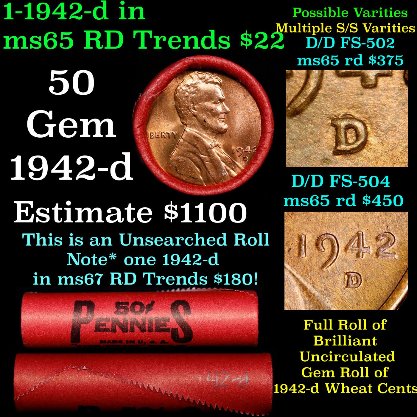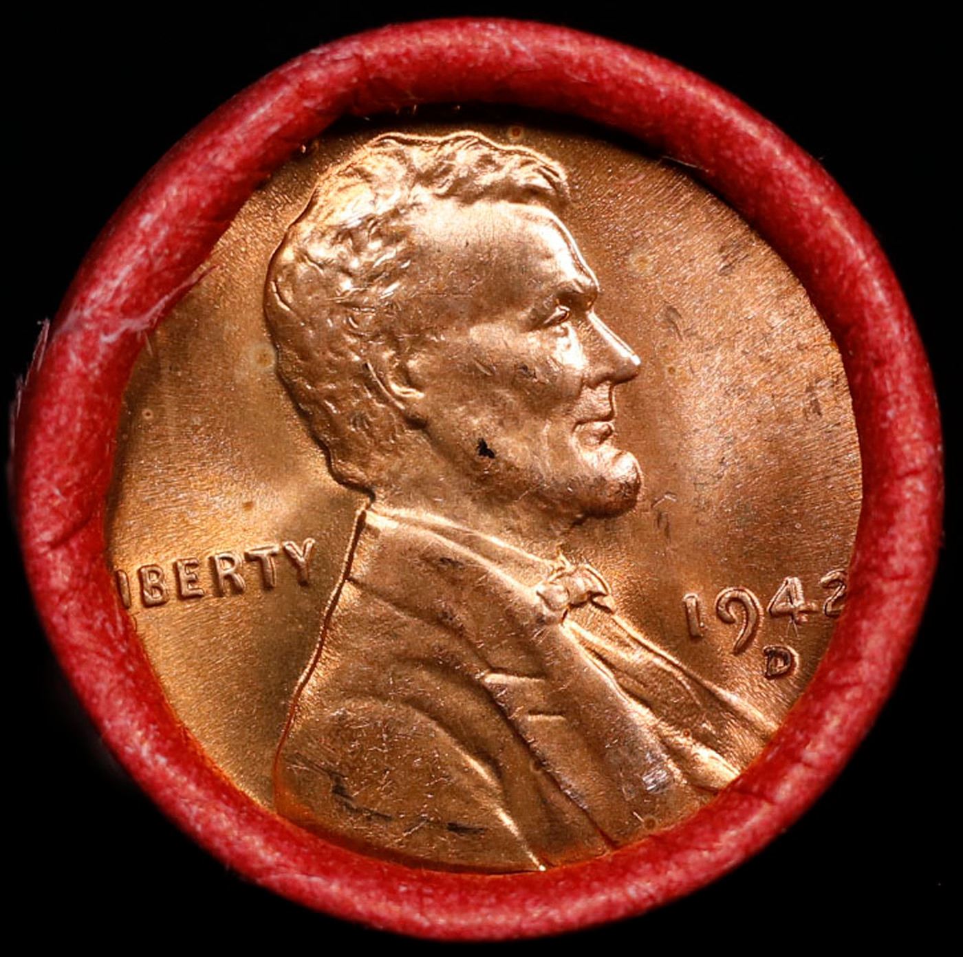 BU Shotgun Lincoln 1c roll, 1942-d 50 pcs Steel-Strong Wrapper 50c. A terrific Shotgun roll of Lincoln cents in a steel strong wrapper. Most if not all coins should be cherry red.