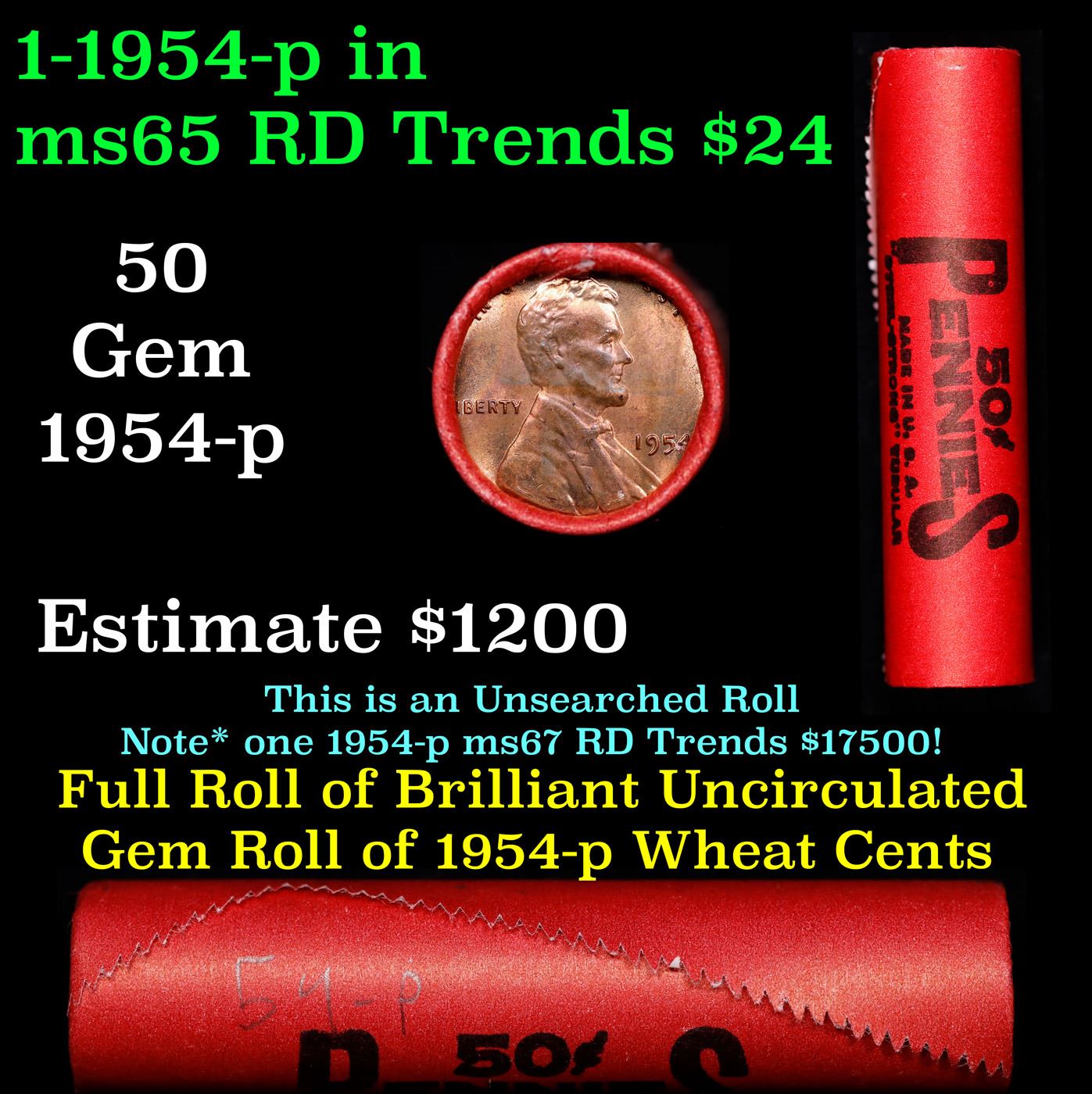BU Shotgun Lincoln 1c roll, 1954-p 50 pcs Steel-Strong Wrapper 50c. A terrific Shotgun roll of Lincoln cents in a steel strong wrapper. Most if not all coins should be cherry red.