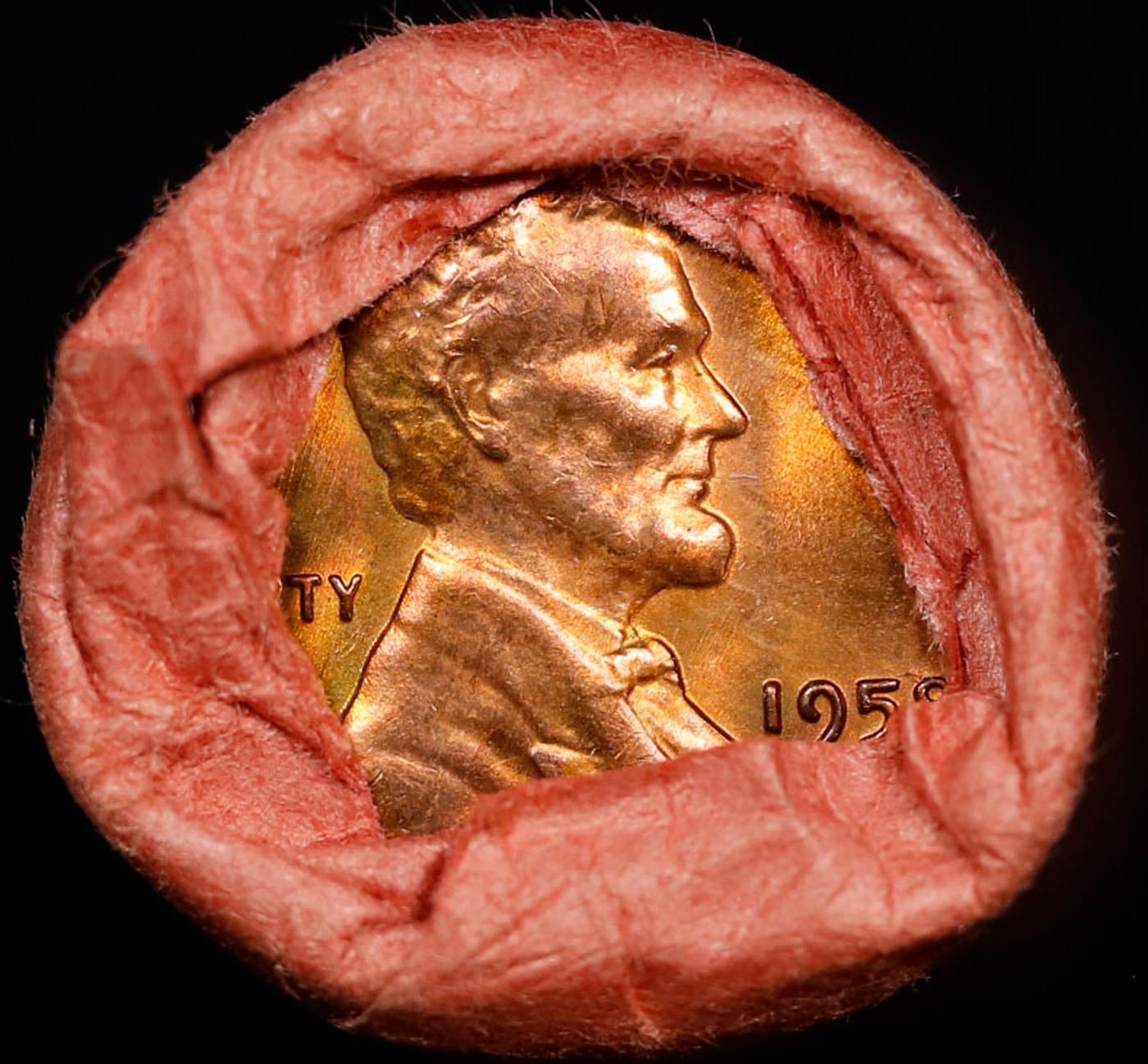 BU Shotgun Lincoln 1c roll, 1958-d 50 pcs Original Brandt Wrapper. A terrific Shotgun roll of Lincoln cents in a steel strong wrapper. Most if not all coins should be cherry red.