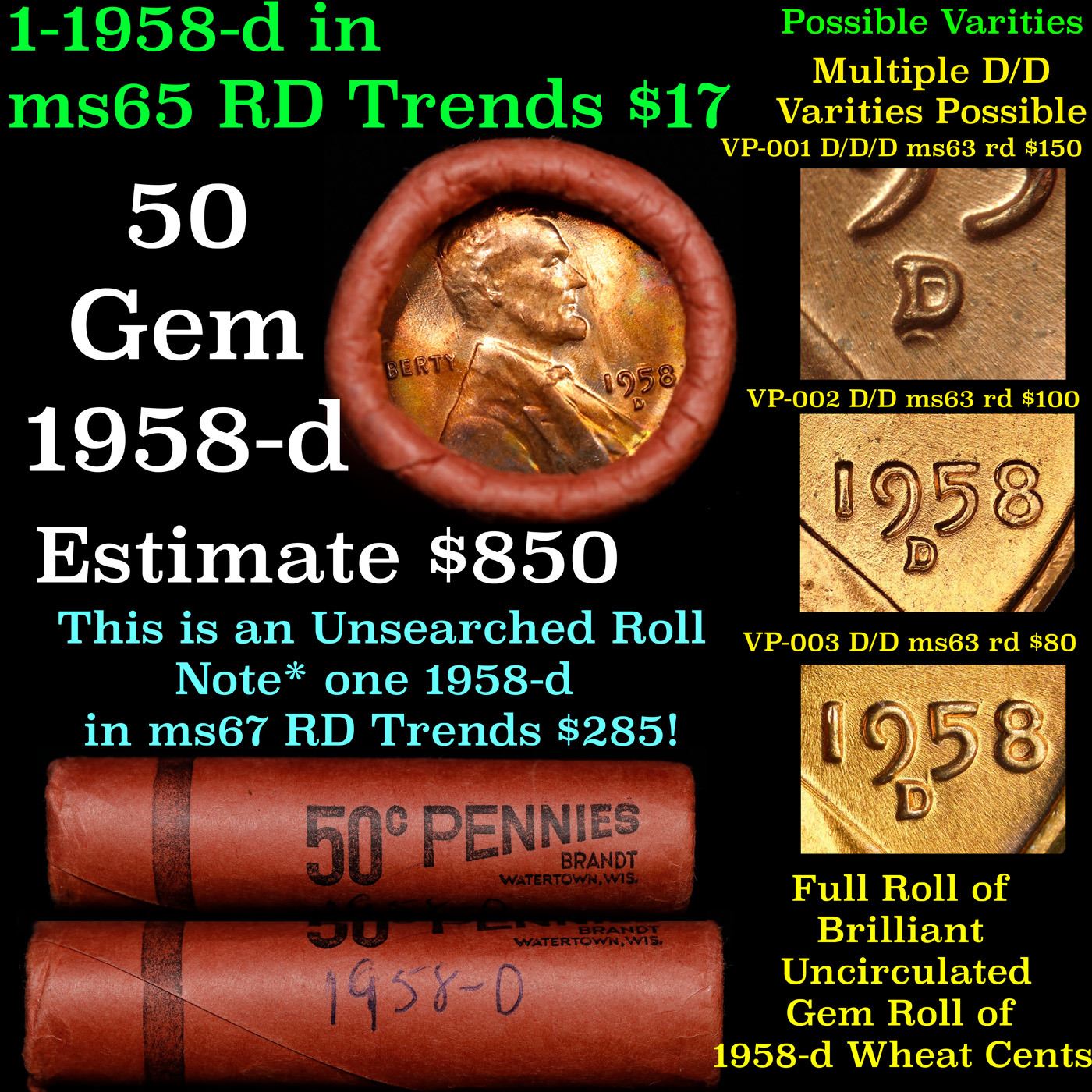 BU Shotgun Lincoln 1c roll, 1958-p 50 pcs Original Brandt Wrapper. A terrific Shotgun roll of Lincoln cents in a steel strong wrapper. Most if not all coins should be cherry red.