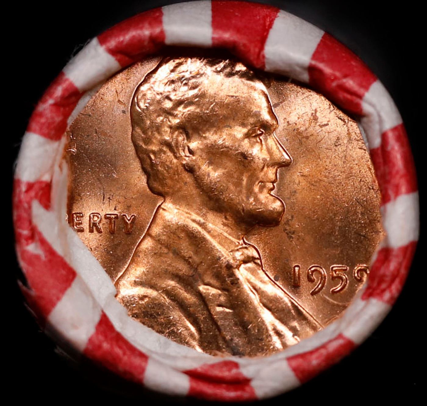 BU Shotgun Lincoln 1c roll, 1959-p 50 pcs Steel-Strong Wrapper 50c. A terrific Shotgun roll of Lincoln cents in a steel strong wrapper. Most if not all coins should be cherry red.