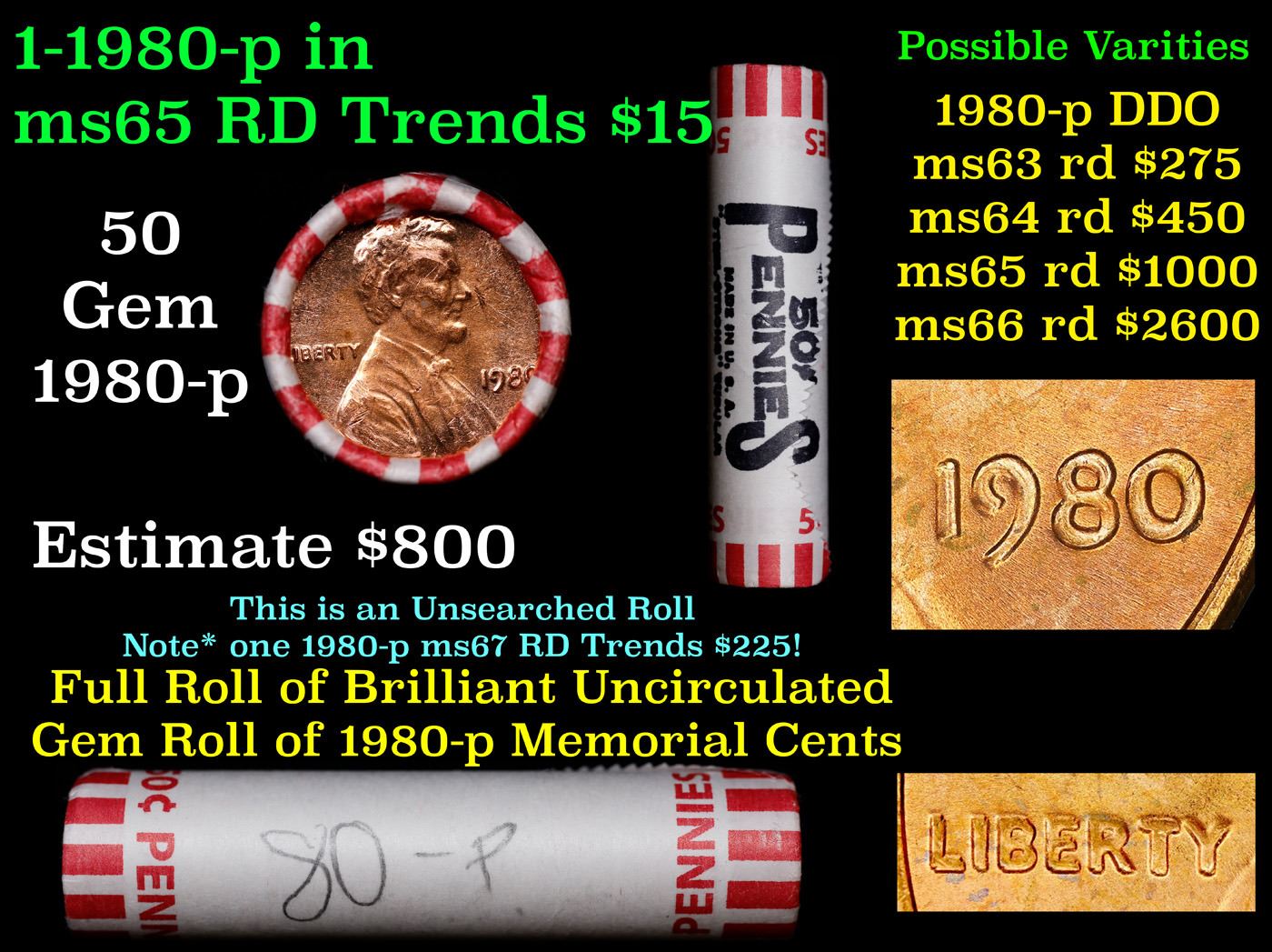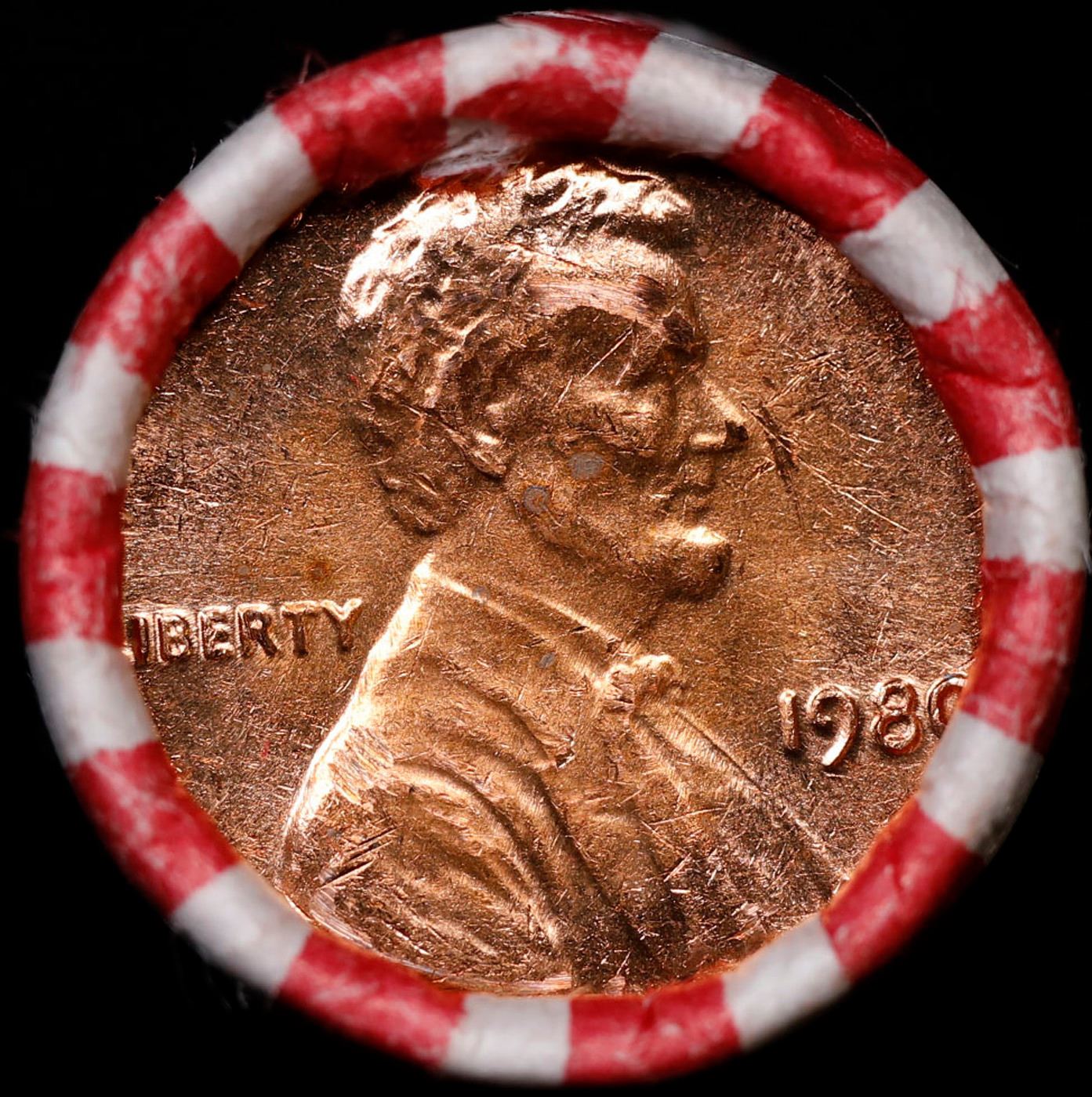 BU Shotgun Lincoln 1c roll, 1980-p 50 pcs Steel-Strong Wrapper 50c. A terrific Shotgun roll of Lincoln cents in a steel strong wrapper. Most if not all coins should be cherry red.