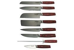 Includes: Nakiri with 6.5" blade; Santoku with 7" blade; Slicing with 8" serrated blade; Chef's with 8" blade; Utility with 6" blade; (4) Steak with 4.5" blade; Paring with 3.5" blade; Sharpening steel with 9" rod