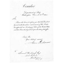 (1791 - 1868)  Fifteenth President of the United States whose hands-off attitude toward states' rights directly contributed to the start of the Civil War. Fine, partly-printed L.S. as Secretary of State, 1p. 4to., Washington, Mar. 10, 1845, to Samuel Kneap, U.S. Consul to Cartegena, announcing his appointment as Secretary of State. Tipped to another sheet, boldly signed and fine.