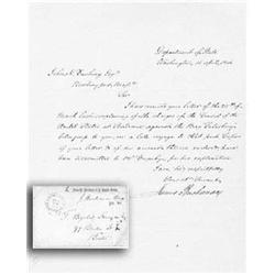 (1791 - 1868) Fifteenth President of the United States whose hands-off attitude toward states' rights directly contributed to the start of the Civil War. L.S. as Secretary of State, 1p. 4to., Washington, Apr. 16, 1846 to John N. Cushing noting his receipt of his letter ""...complaining of the charges of the Consul of the United Sates at Bordeaux, against the Brig 'Salisbury' belonging to you, on a late voyage to that port. Copies of your letter & of his account therein enclosed have been transmitted to Mr. Grigsby , for his explanation..."" Usual folds do little to affect signature, otherwise near fine. Together with an envelope addressed to one T. Biglow Laurence of Boston, franked by Buchanan's secretary in 1857 and a copy of a land grant bearing Buchanan's secretarial signature. Three pieces.