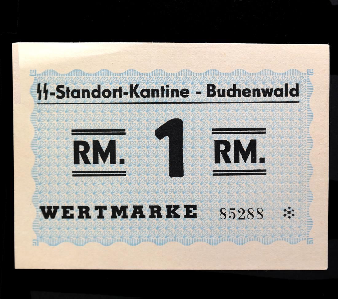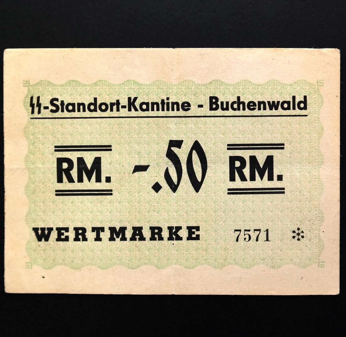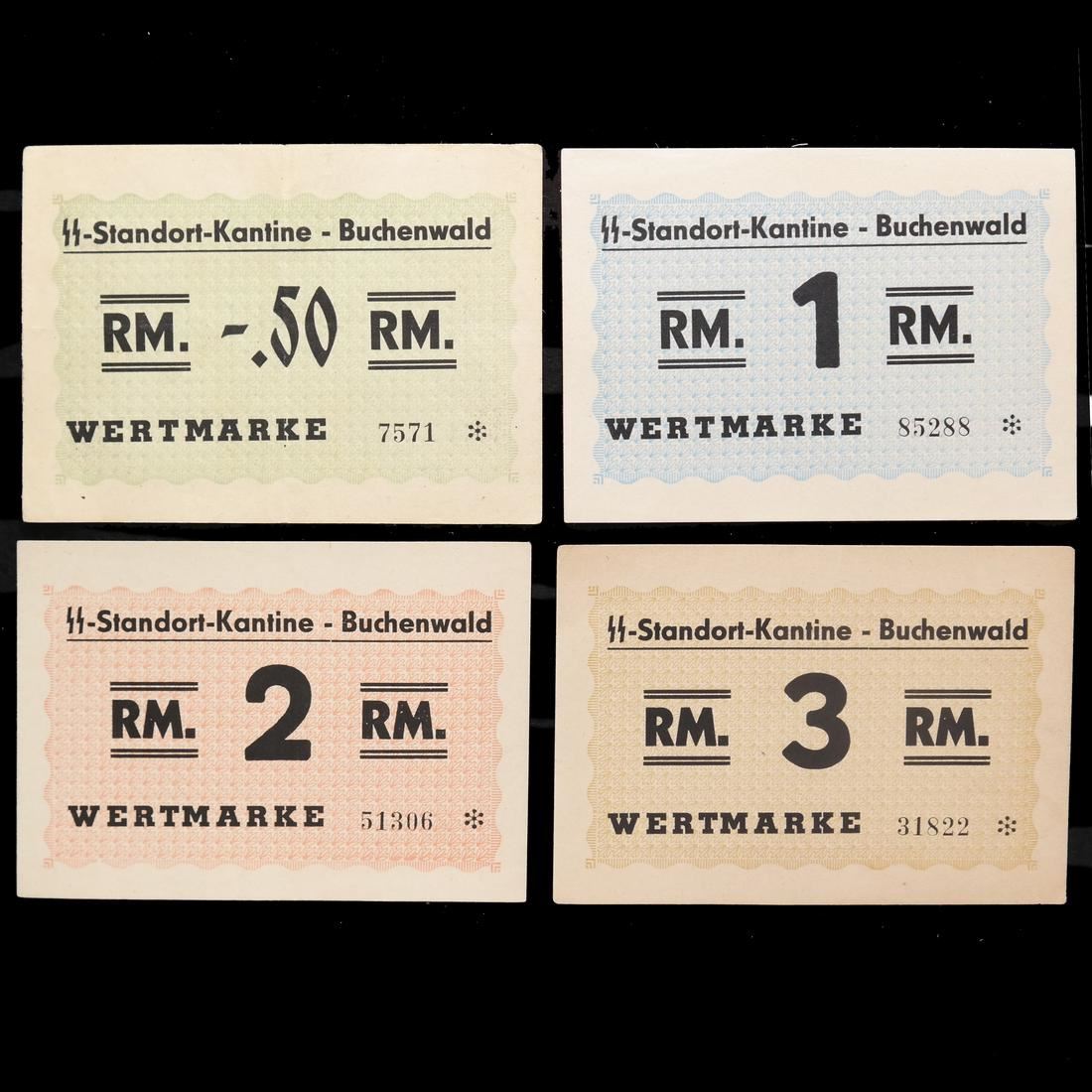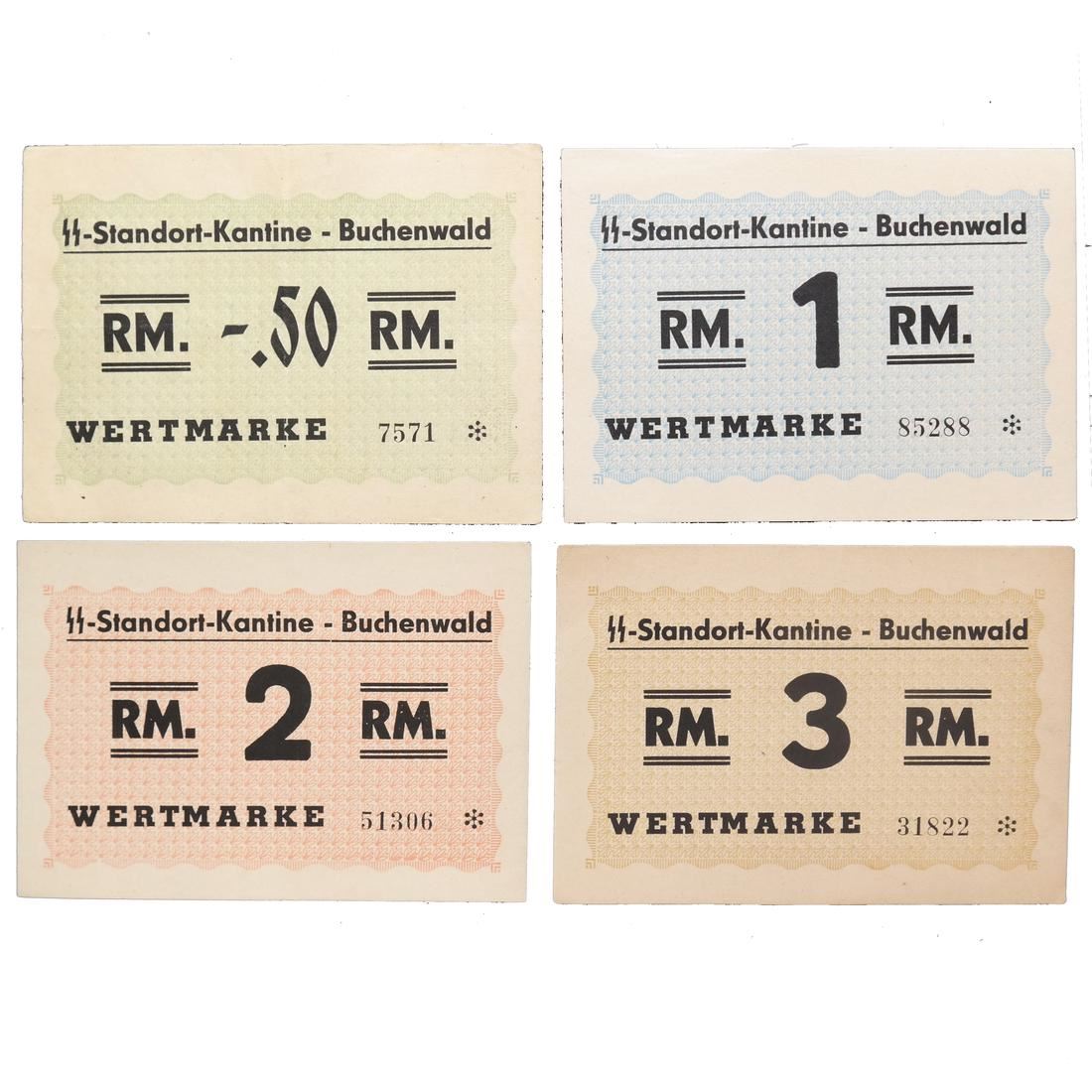 Four different SS-Standort-Kantine - Buchenwald / Wertmarke notes, 50pf, 1RM, 2RM and 3RM denominations, some creases, sound and VF-AU.