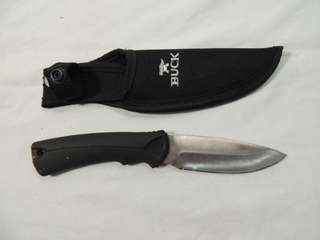 BUCK FIXED BLADE HUNTING KNIFE SMALL KNOCH IN BLADE. NYLON SHEATH BUCK BRAND HUNTING KNIFE SEE PHOTOS FOR MORE DETAILS.