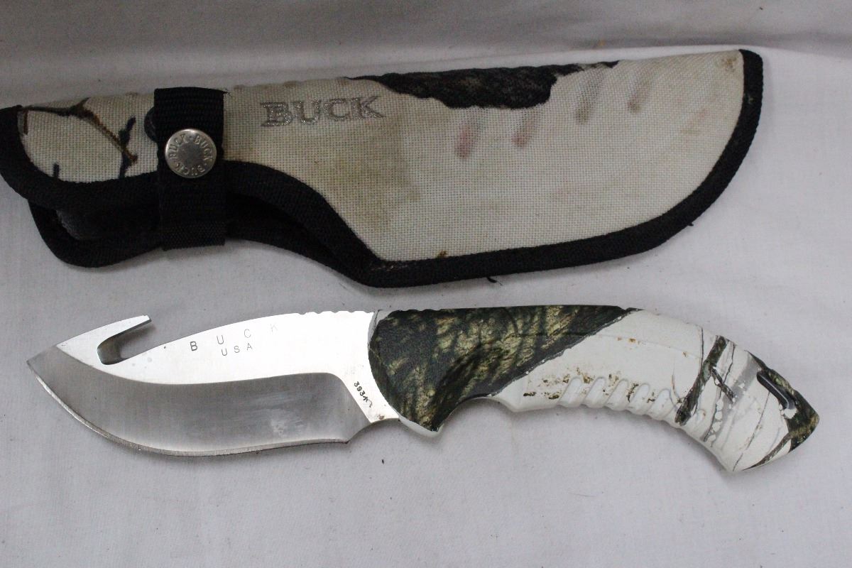 BUCK Fixed Blade with Gut Hook and Camo Handle with Sheath