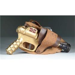 BUCK ROGERS DISINTEGRATOR GUN WITH HOLSTER. Rarely is this model found with the holster. The gun retains its original gold paint and still works. When the trigger is pulled a light flashes in the red window above. The holster still retains its original embossing “Buck Rogers Atomic Pistol”. CONDITION: Retains original gold and black paint, and condition is generally good. Very slight surface rust in a couple of small spots. A great example. 1-4677 (650-950)