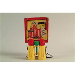 Lot # 1176 BUCK ROGERS SUPERSONIC GLASSES WITH OB. Copt. 1963. Colorful hard plastic binoculars made by Norton-Honer Mfg. Co. Box graphics shows Buck peering at space rockets and far away planets. Not really so powerful 3X40 official glasses! SIZE: 5-1/2" l. CONDITION: Toy is near excellent. Box has separated-good condition. 1-28821 (125-250)