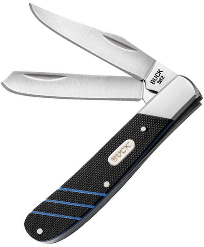 3 1/2" closed. 420J2 stainless clip and spey blades. Black G10 handles with blue stripe trim. Slanted nickel silver bolster. Inlay shield.