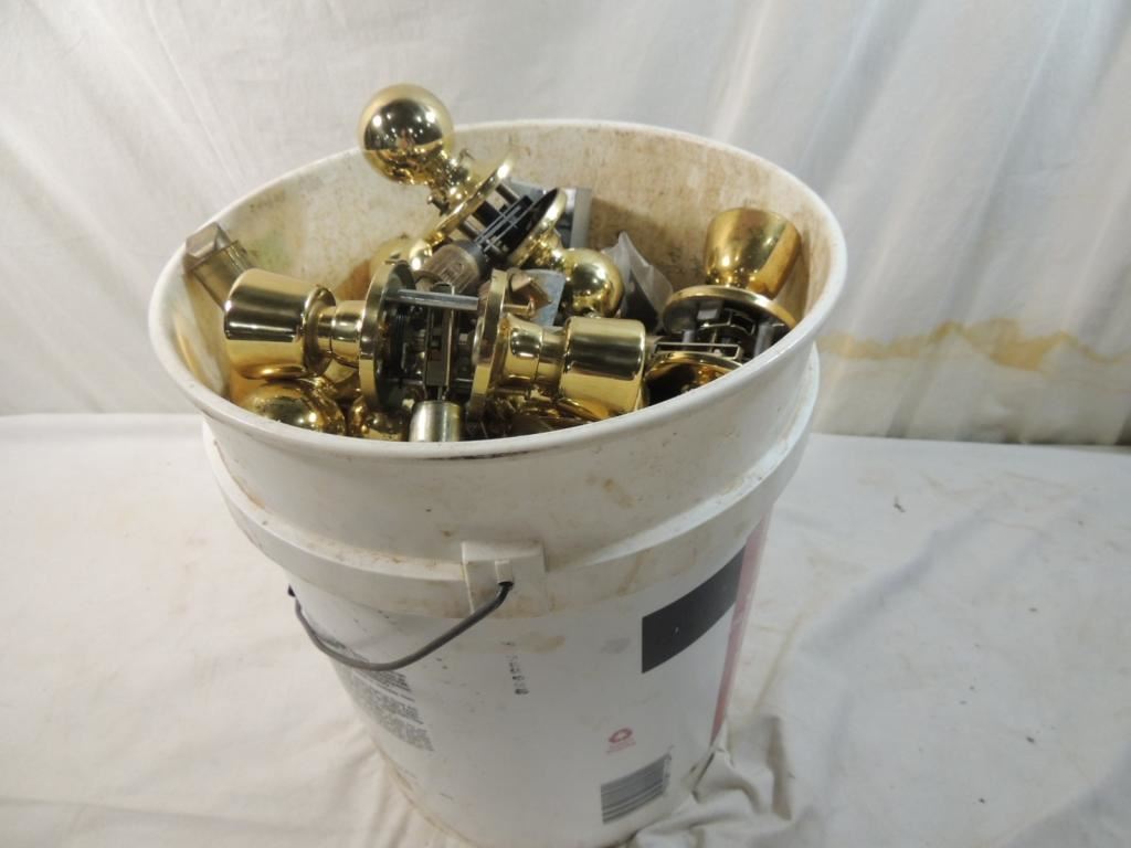 BUCKET ASSORTED HANDLES, HARDWARE, BRASS, DOOR HANDLES, LOCKING HANDLES, HARDWARE, HOME REPAIR AS SHOWN SEE PHOTO FOR MORE DETAILS.