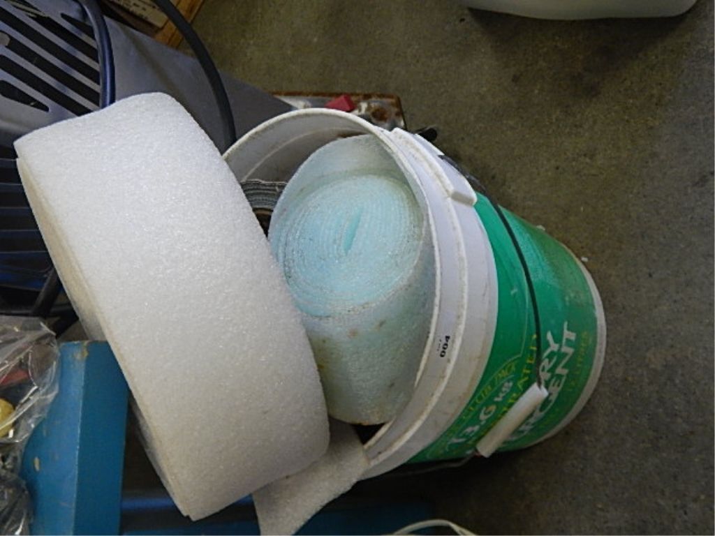 BUCKET OF FOAM AND DRYWALL PAPER ETC