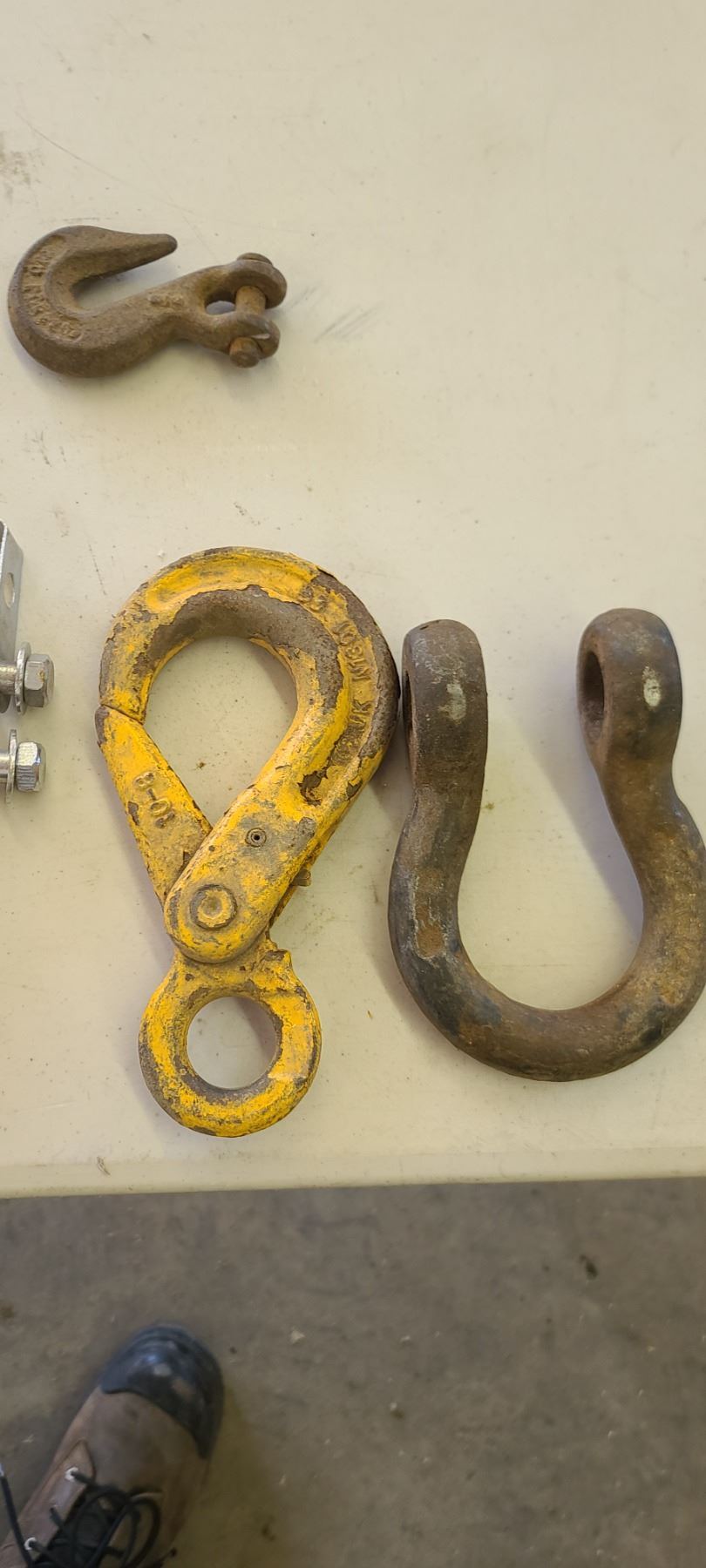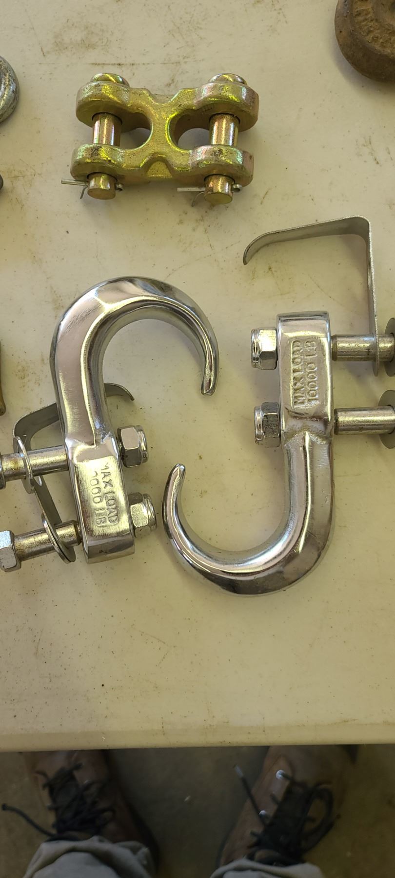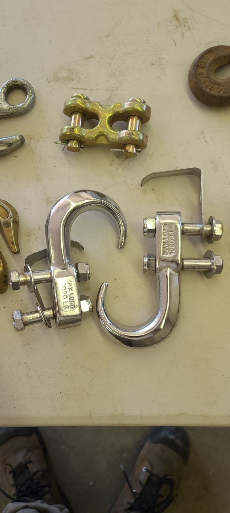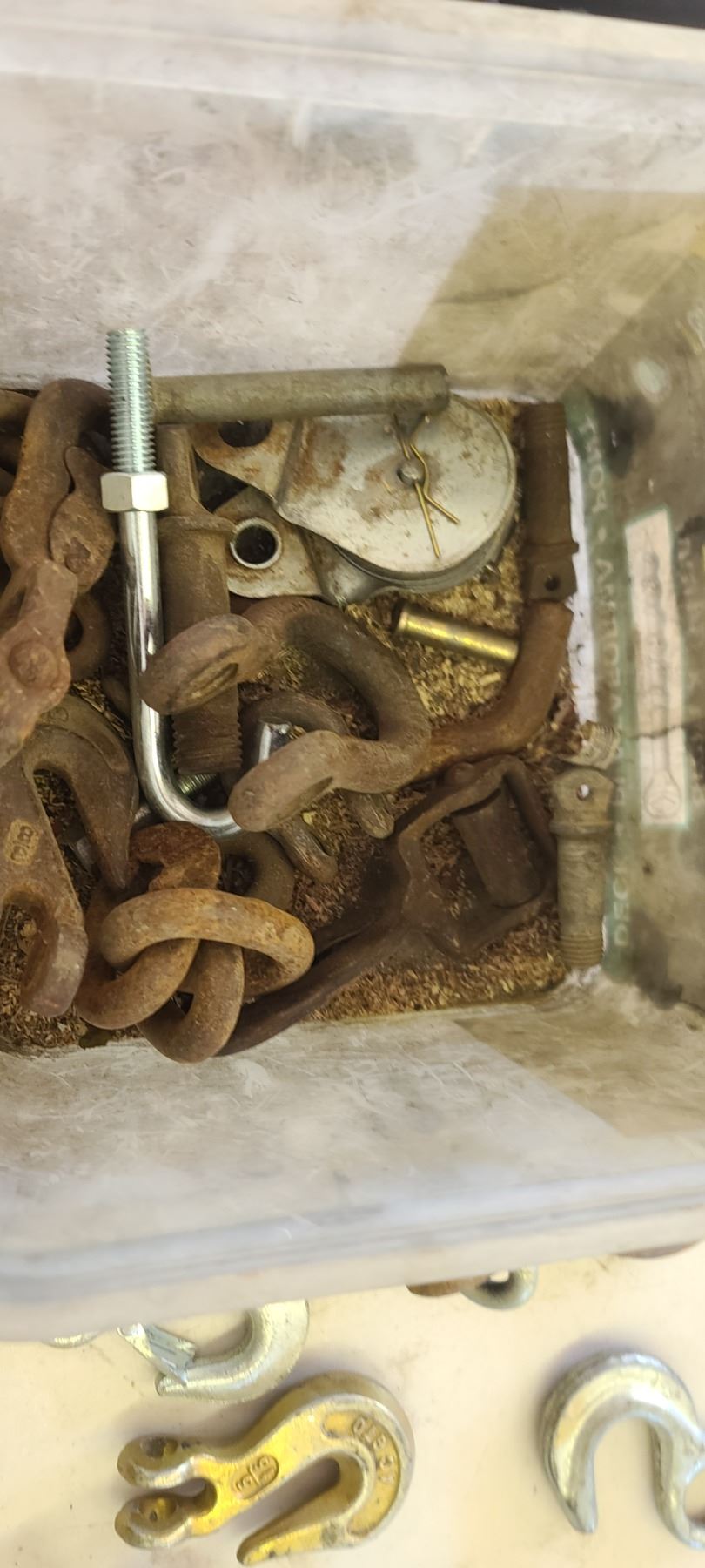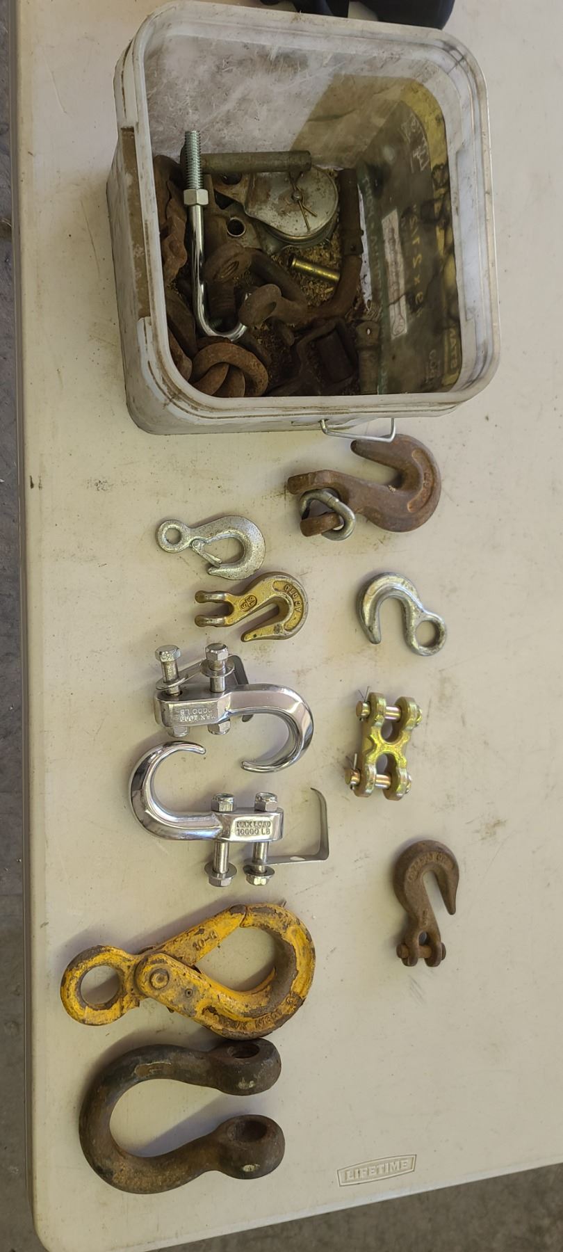 BUCKET WITH BUMPER HOOKS, ASSORTED HOOKS, AND CLEVIS PINS