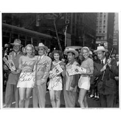 <b>481. BUD ABBOTT AND LOU COSTELLO</b> Immensely-popular film comedy team, the chubby, dim-witted Lou Costello playing opposite the tough, conniving Bud Abbott in many films and shorts from the late 1930's well into the 1950's. Nice I.S.P. 10" x 8" b/w group photograph for the Sheriff's Annual Show of 1944 at the Shrine Auditorium [Los Angeles?] showing Bud Abbot and Lou Costello with several models beside a couple men with big smiles on their faces (likely Sherrif's attending the event). Inscribed in blue ink by Abbot in a lighter portion of the photograph with Costello's signature underneath. A few very light creases, otherwise near fine condition. <b>$800-1,200</b>