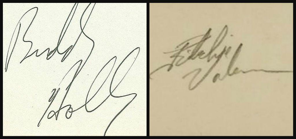 Autographs from two of Rock n Roll's greats on 2 separate pieces of paper. These autographs are some of the rarest to come by due to their short carears. Buddy dying at 22, and Richie Valens dying at 17. Buddy Holly who recorded a vast catalogue of songs in only two years 56-58, and has aspired many artists. Buddy Holly (4x6) inches page with PSA/DNA coa. and Richie Valens who also had recorded a vast catalogue of songs from 58-59. Richie Valens cut from an album page (4x4) inches with PSA/DNA coa.