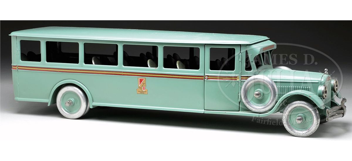 A classic pressed steel toy from the 1920-1930s era. Buddy L had a tendency to copy in miniature form the real life vehicles of the time period. Perhaps every male child during this period would have liked to have had this toy and today this is a must have for collectors of pressed steel toys. An extremely well executed and extremely durable bus with opening front doors and an array of what appears to be comfortable seating within. Dual real wheels, spare tires on right and left cowl, a fancy nickel plated front bumper with matching headlights further add to the allure of this piece. Overall total exterior paint restoration, upon examination it appears to be very sound and structurally free of rust or deterioration to the metal. More than likely the paint had darkened or was dull and a collector felt it was best to renew and refresh the paint for visual appearance. Interior of bus has original finish, including decals on both doors. SIZE: 28" l. CONDITION: As stated above. 1-13319