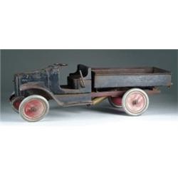 BUDDY-L DUMP TRUCK. Black Buddy-L dump truck with hydraulic dump mechanism. SIZE: Approximately 24 1/2” l. CONDITION: Has original paint, which is worn, and has overall scattered surface rust. 1-4681 (350-650)