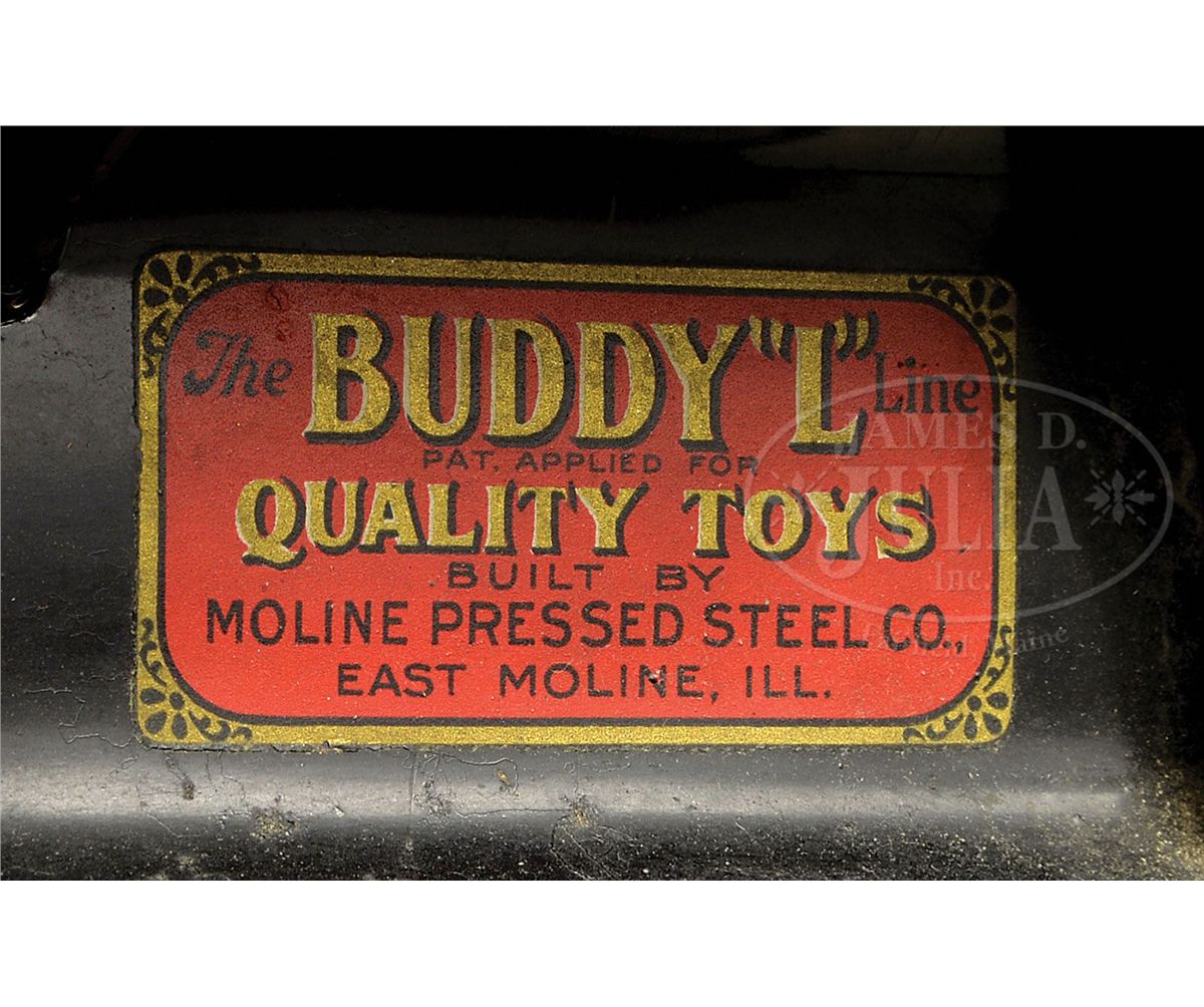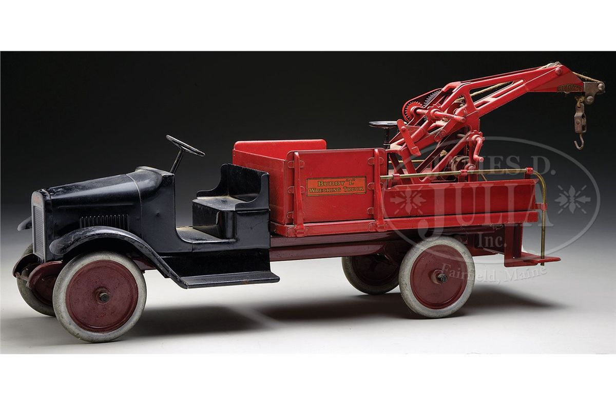 A noteworthy example of the open cabbed Buddy "L" wrecker in remarkable as found, untouched condition. A classic toy that every child must have enjoyed playing/operating with, especially the boom to retrieve other broken down Buddy "L"'s. Boom retains its original hooks and cords, die cast gears are intact, but starting to show some signs of deterioration. The truck would benefit greatly from a good cleaning to remove decades of shelf dust thus the paint would be restored to its original vibrancy. SIZE: 32" l. CONDITION: Overall as stated above. Most notable wear is some chipping on black edge fenders and minimal loss to one decal on side of truck body. 1-13166