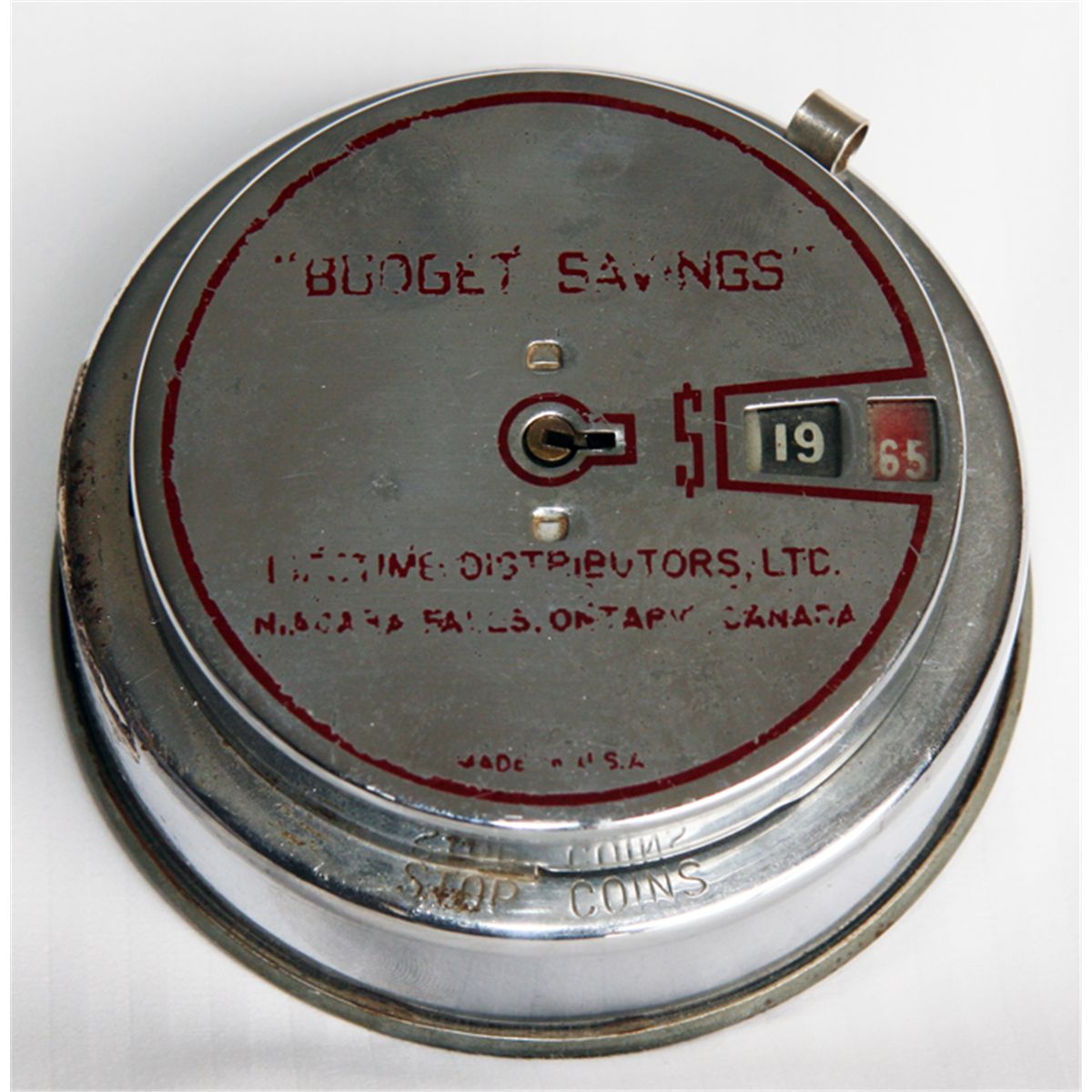 ”BUDGET SAVINGS” NIAGARA FALLS, ONTARIO. A CYLINDRICAL STEEL BANK. Slot along side. No handle, no key, no serial number. 10cm in diameter. 4cm in height. Nickel plated steel. Maker-unknown. No patent information. Slide lever/date counting window on top. Also known as the ‘Add 2 Bank’. VF.