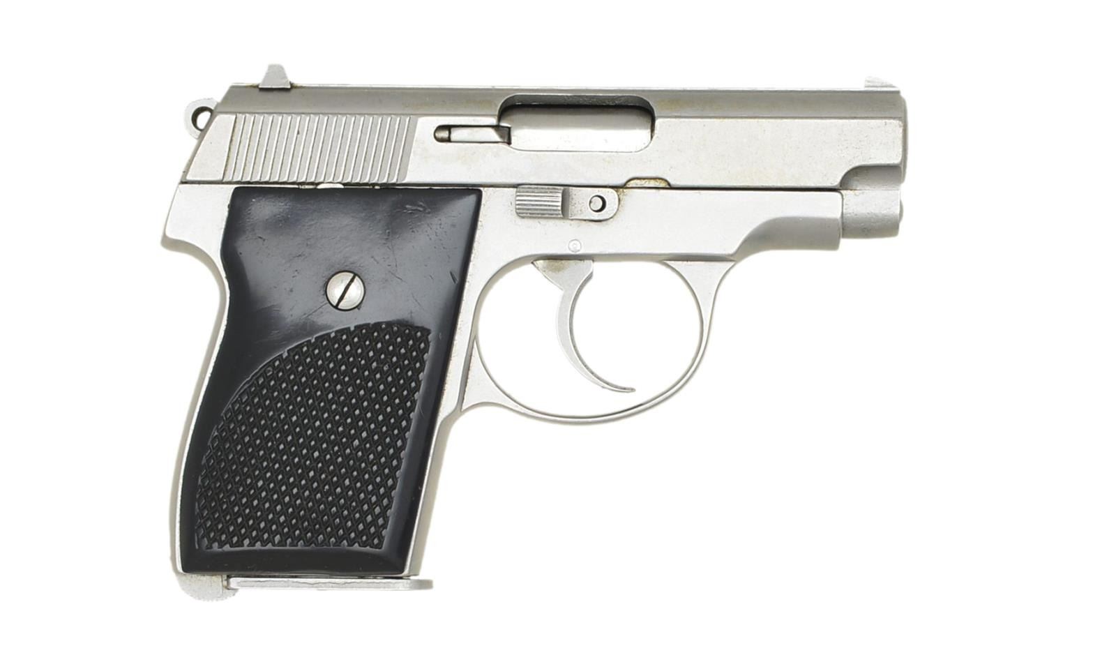 Cal. 25 ACP. S# 3604. Bbl. 2.6". Mfg. in USA 1973-1977 & marketed by Norton in 1977. Stainless dbl. action w/ slide mounted Walther style safety. Slight raised rib w/ grooves having simple blade front sight & drift adj. rear. Ring style hammer, checkered black plastic grips & European style mag. latch at rear of butt. Model 1911 style slide lock. MAGS: 1 factory stainless 6 rd. UNATTACHED ACCESSORIES: black & silver Norton 2 piece box (some scuffs on edges) plus manual. CONDITION: all aspects near excellent including bore; w/ very faint marks on grips. (21-1041/NW). MODERN. $300-400.