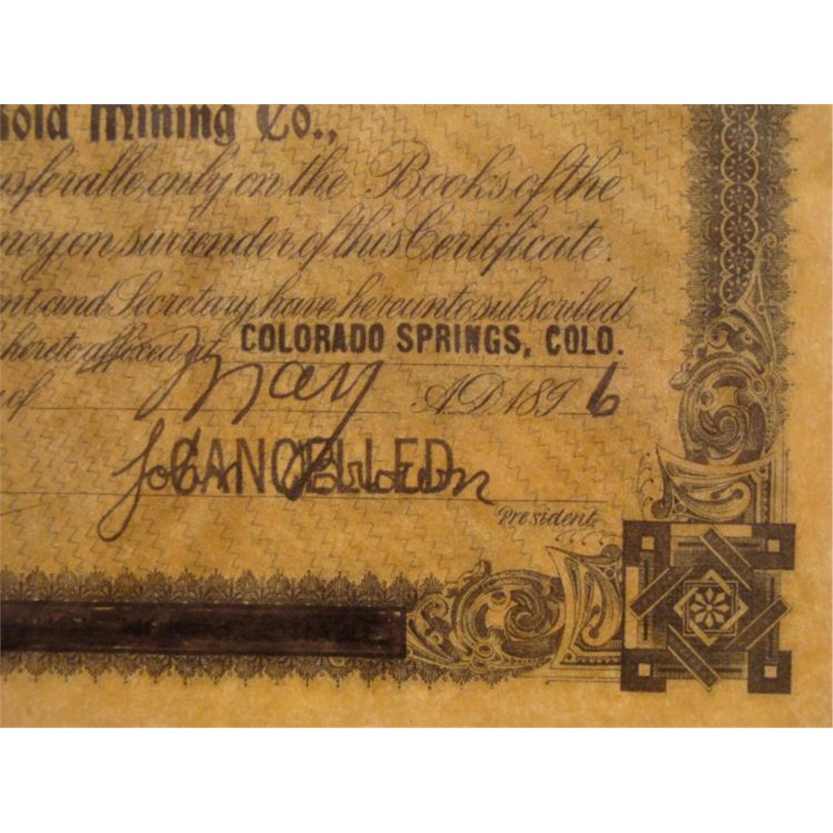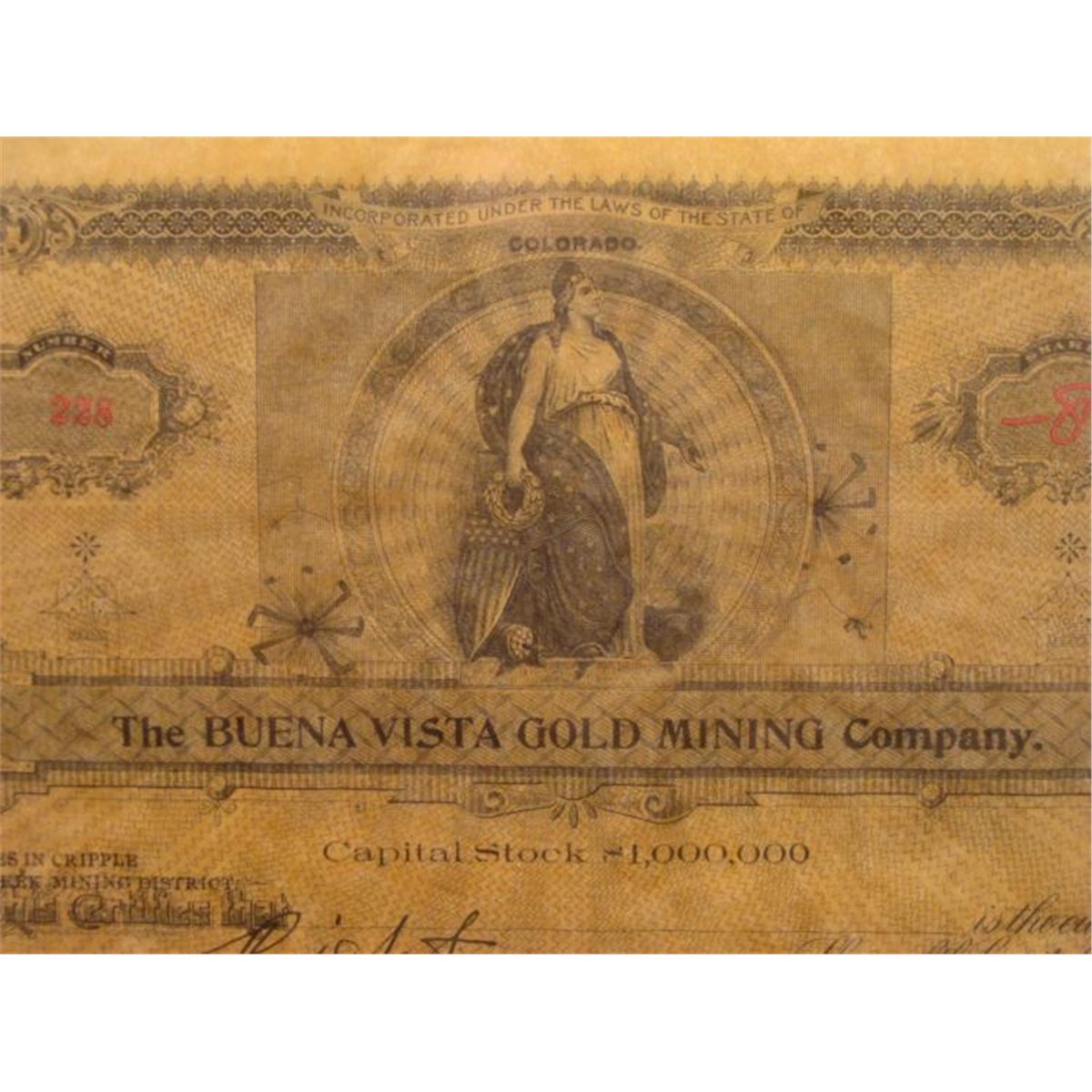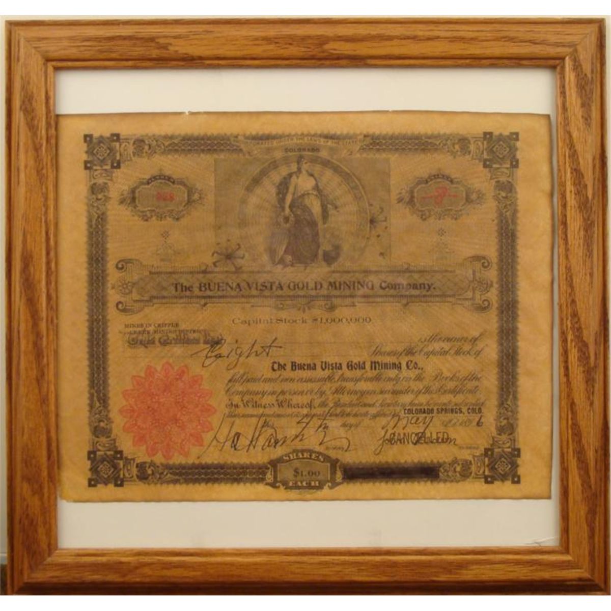 "THE BUENA VISTA GOLD MINING COMPANY" STOCK CERTIFICATE DATED 1896-FRAMED * CERTIFICATE IS FOR 8 SHARES OF THE GOLD MINES STOCK--SHARED $1. EACH-SIGNED & DATED * 11" SQUARE FRAME * *