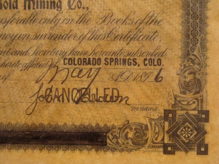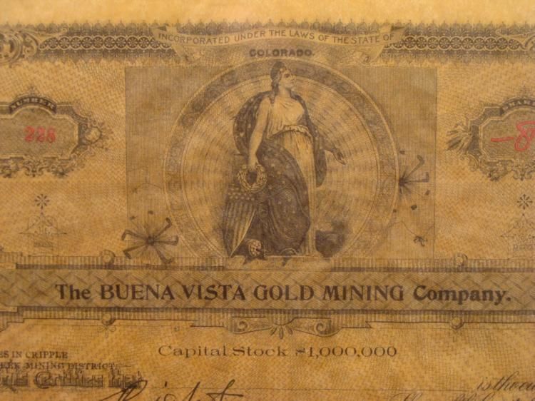 "THE BUENA VISTA GOLD MINING COMPANY" STOCK CERTIFICATE DATED 1896-FRAMED * CERTIFICATE IS FOR 8 SHARES OF THE GOLD MINES STOCK--SHARED $1. EACH-SIGNED & DATED * 11" SQUARE FRAME * *
