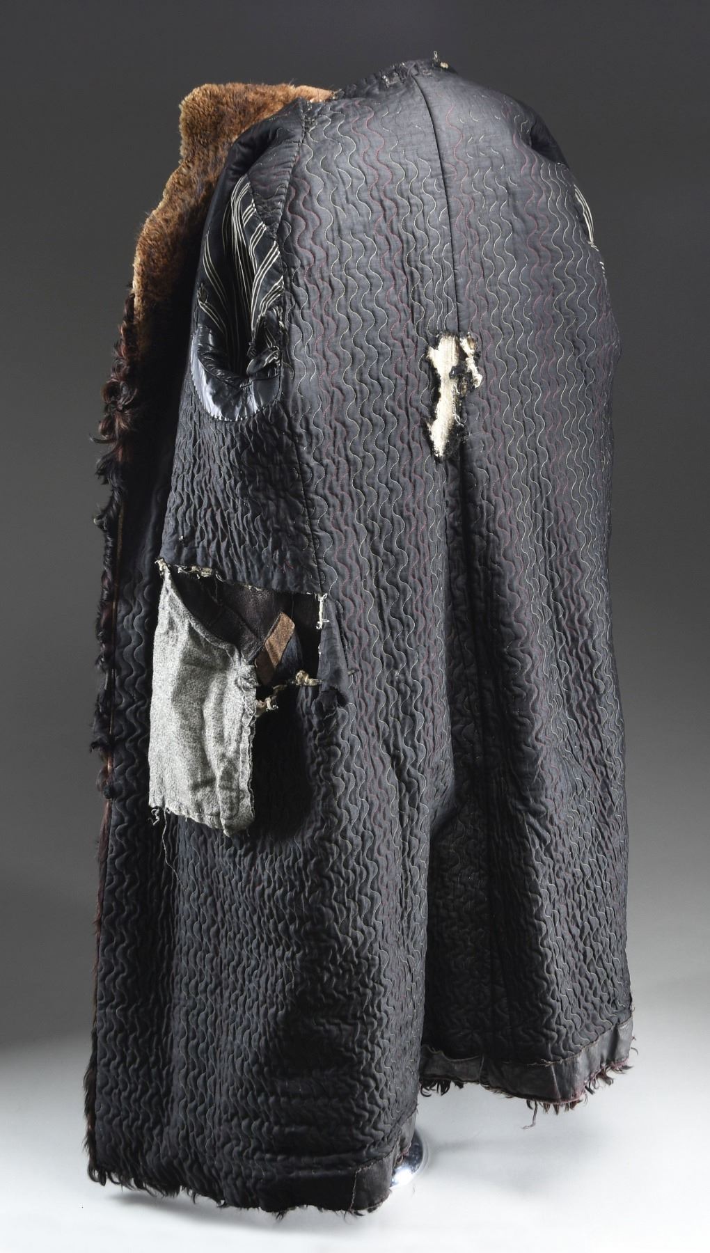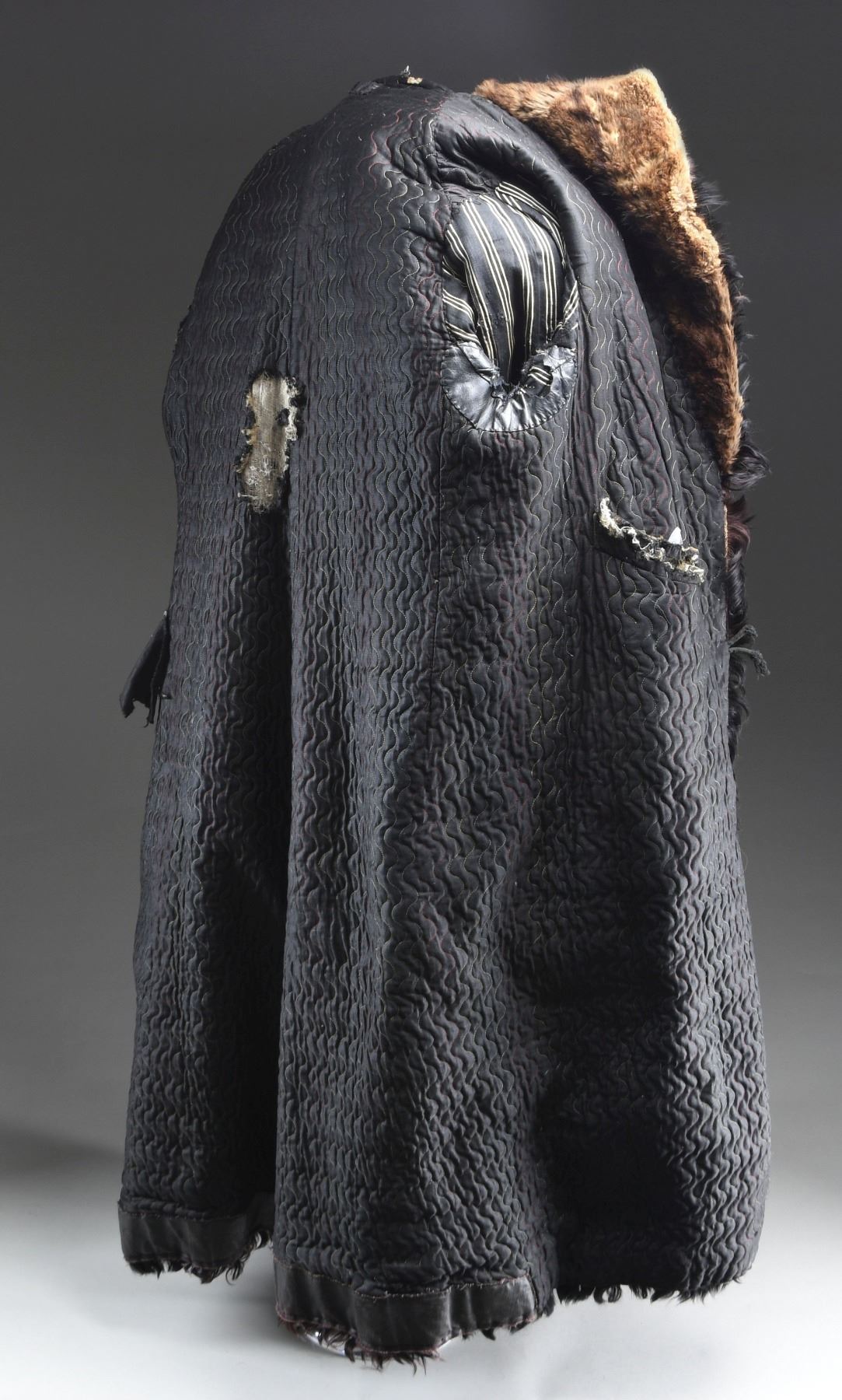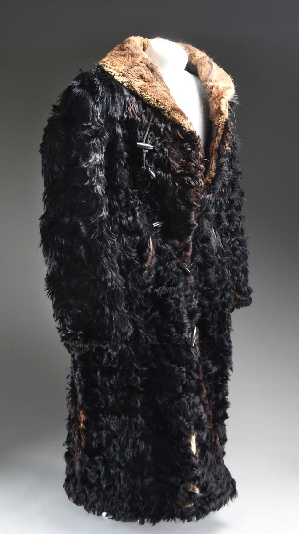 A very large, heavy winter coat made from a bison hide in the late 19th or very early 20th century. The outside is covered with black fur with brownish fur underneath. The collar is closely cropped brown fur. There are four wooden toggle buttons down each side of the front. A diagonal slash pocket adorns each side of the front at about the midpoint. The sleeves are lined in a white-striped black cotton material. The body lining appears to be a polished black cotton with wavy sewn lines down the entire length in various colors of thread. The pocket bags are a flecked cotton flannel material. There is an interior pocket on the left side. CONDITION: the outside of the coat has a good appearance, with only minor fur loss. The lining is torn and worn in a few places, not affecting the overall integrity of the coat. There is a separation at the peak of the collar and a few other places throughout the coat. A fine example of a buffalo hide coat, once a common sight in Western America. (02-23375/BF). $750-1,500.