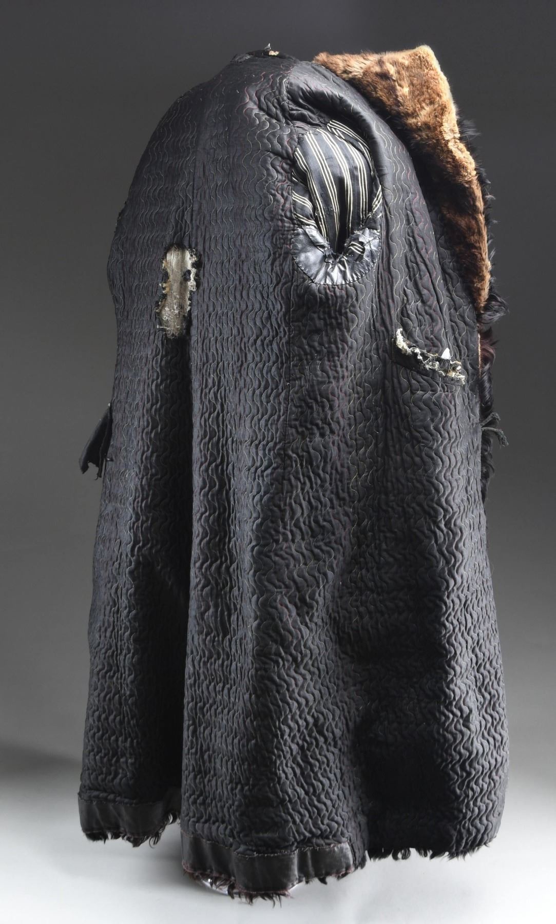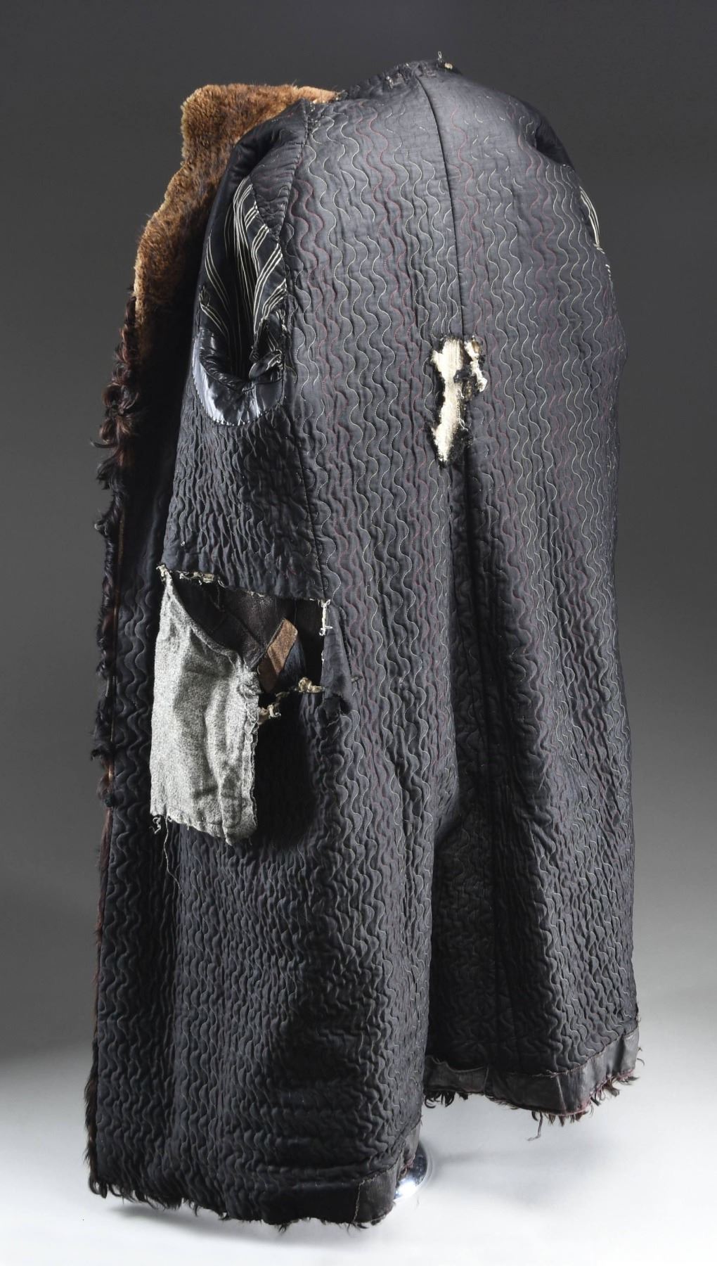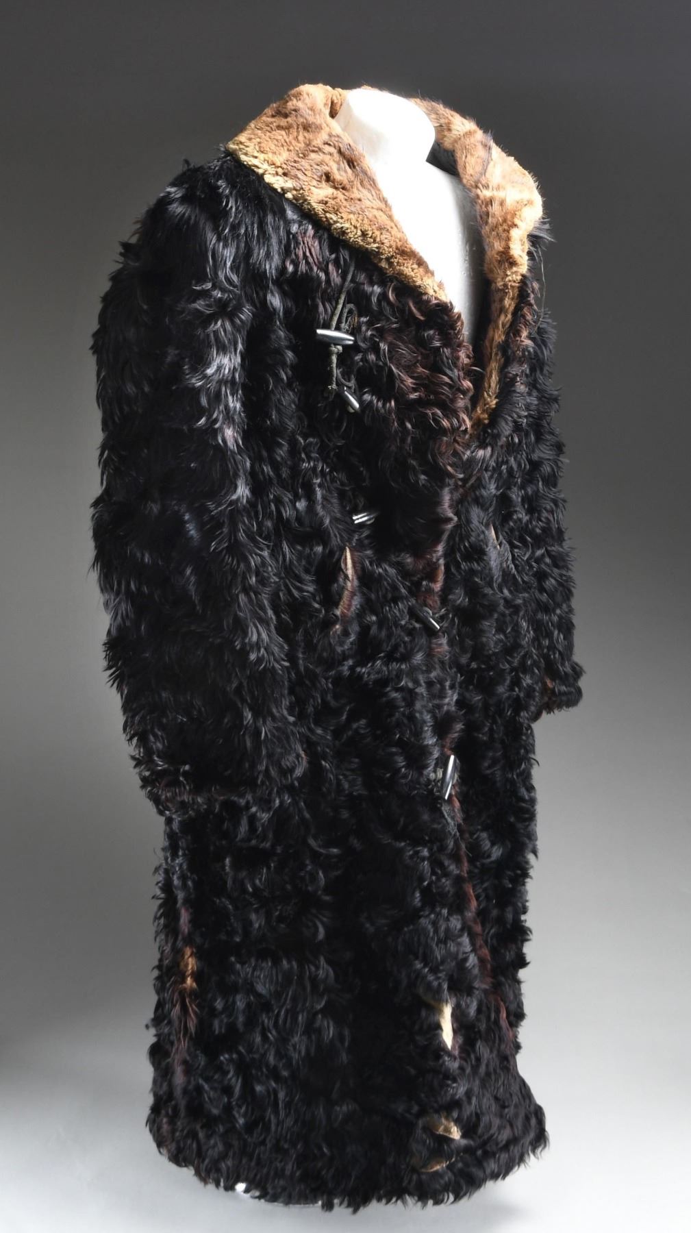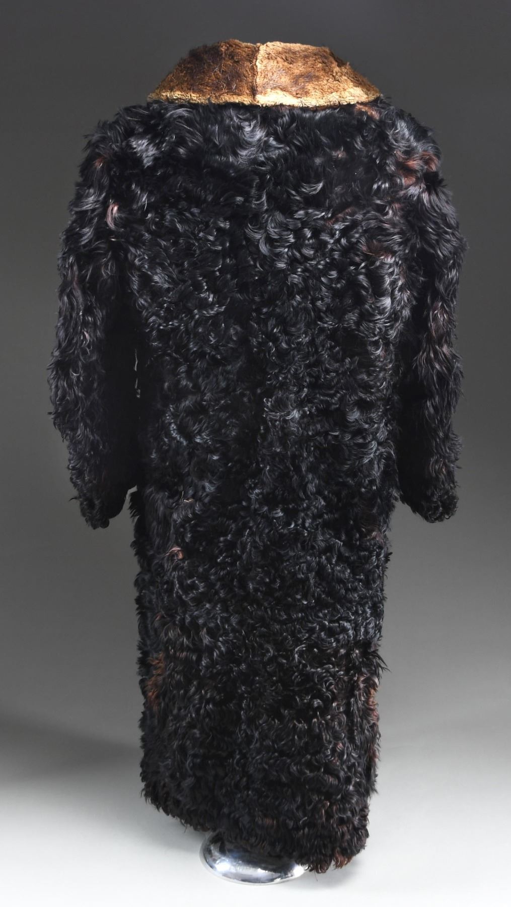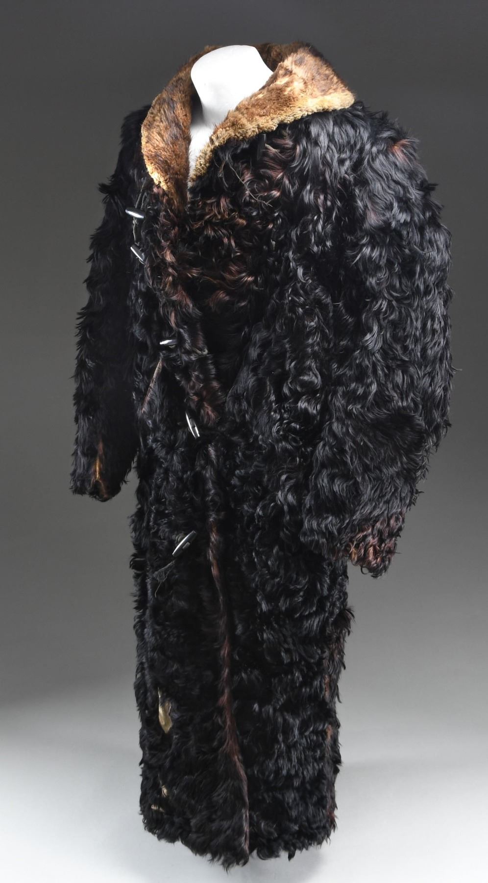 A very large, heavy winter coat made from a bison hide in the late 19th or very early 20th century. The outside is covered with black fur with brownish fur underneath. The collar is closely cropped brown fur. There are four wooden toggle buttons down each side of the front. A diagonal slash pocket adorns each side of the front at about the midpoint. The sleeves are lined in a white-striped black cotton material. The body lining appears to be a polished black cotton with wavy sewn lines down the entire length in various colors of thread. The pocket bags are a flecked cotton flannel material. There is an interior pocket on the left side. CONDITION: the outside of the coat has a good appearance, with only minor fur loss. The lining is torn and worn in a few places, not affecting the overall integrity of the coat. There is a separation at the peak of the collar and a few other places throughout the coat. A fine example of a buffalo hide coat, once a common sight in Western America. (02-23375/BF). NON-GUN. $400-600.