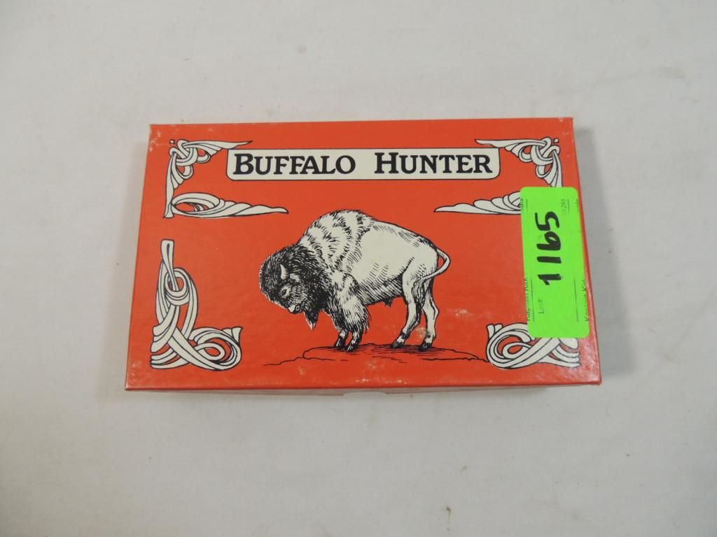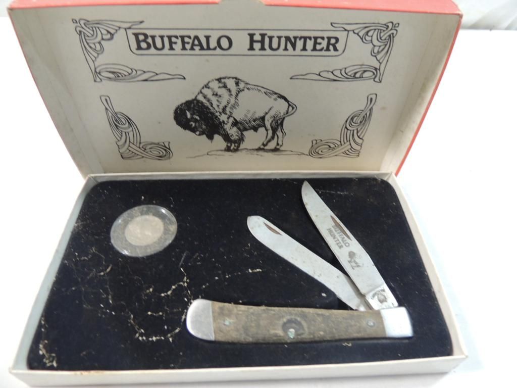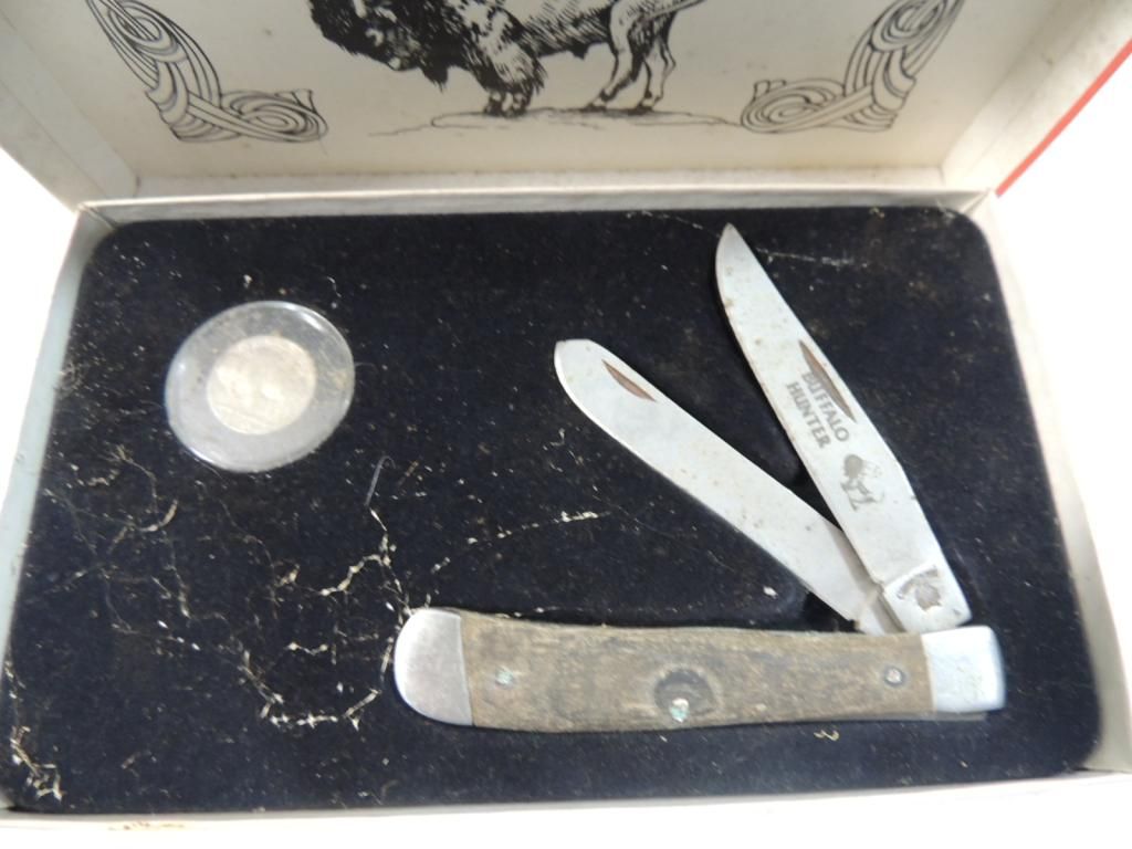BUFFALO HUNTER POCKET KNIFE & COIN SET COLLECTIBLE. VINTAGE. POCKET KNIFE AND COIN. AS SHOWN SEE PHOTO FOR MORE DETAILS.