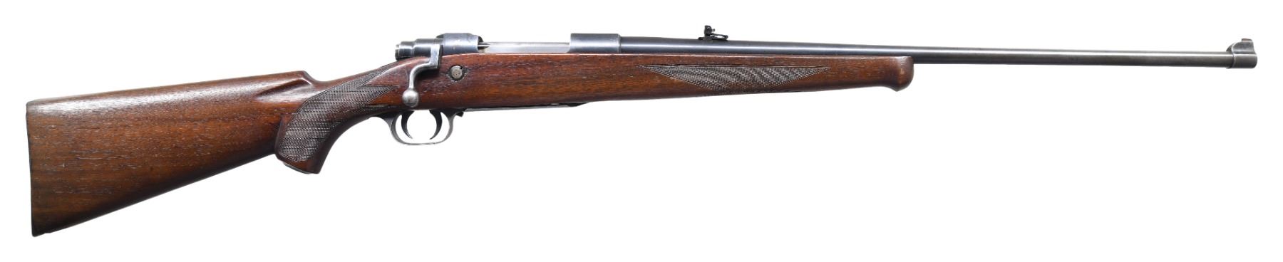 ACTION RIFLE. Cal. 256 Newton. NSN. Bbl. 24" tapered round. Band mounted blade front sight w/ folding leaf rear sight. Action features two rows of 3 locking lugs w/ claw type extractor, dog leg bolt handle having a rotating safety on cocking piece. Double set triggers face each other. Takedown design operates by rotating the hinged floorplate. Schnable tipped straight comb walnut stock. Features include point pattern hand checkering, steel grip cap & buttplate w/ a single recoil lug. Estimated production of 1,000. WEIGHT: 8 lbs. CONDITION: 80% lightly faded blue, showing spots of finish loss. Stock shows light wear w/ scattered scratches & marks. Sound action w/ properly functioning trigger. Bore retains intact rifling w/ dark frosted appearance in the grooves. (25-502/DS). CURIO. $1,200-2,000.