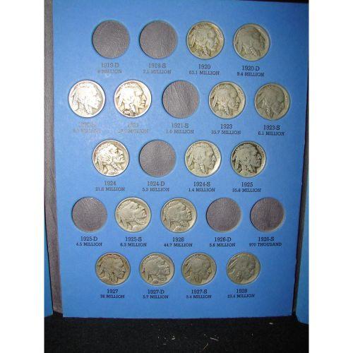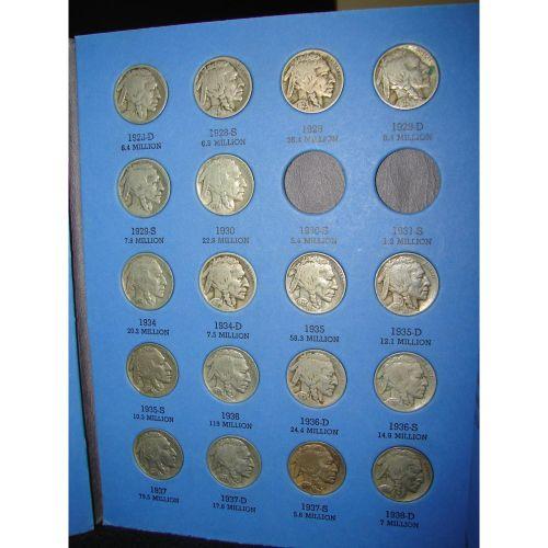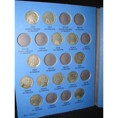 ALBUM OF BUFFALO NICKELS. 1913 to 1938. Missing 1913-D (Raised Ground), 1913-D, 1913-S (Raised Ground), 1913-S, 1914-S, 1915-D, 1915-S, 1917-S, 1918-D, 1918-S, 1919-D, 1919-S, 1921-S, 1924-D, 1925-D, 1926-D, 1926-S, 1930-S, & 1931-S.