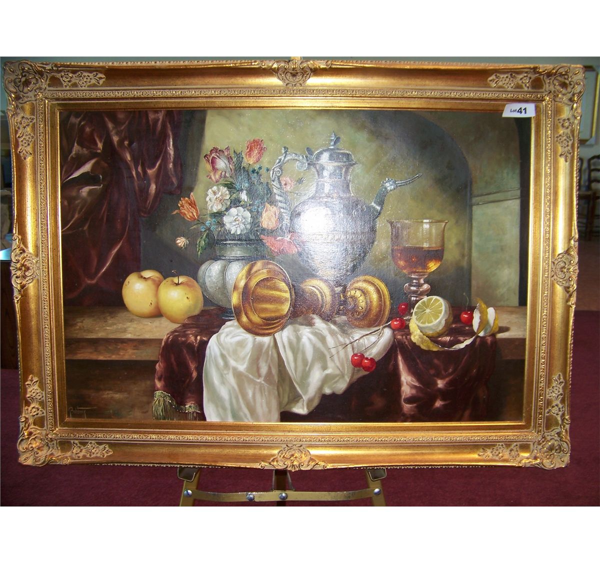 BUHARMITZ ORIGINAL OIL ON CANVAS, STILL LIFE W/ FRUIT FLOWERS & WINE FRAMED 30T X 42W