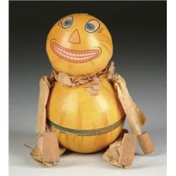 BULBOUS FIGURAL PUMPKIN MAN. Strange dude with spherical body, wire and wood arms and legs. Paper head has decal graphics and crepe paper collar. Rattle noise when shaken. SIZE: Standing 10” t., sitting 6 1/2” t. CONDITION: Good to very good. WP 1-3718 (1,000-1,500)