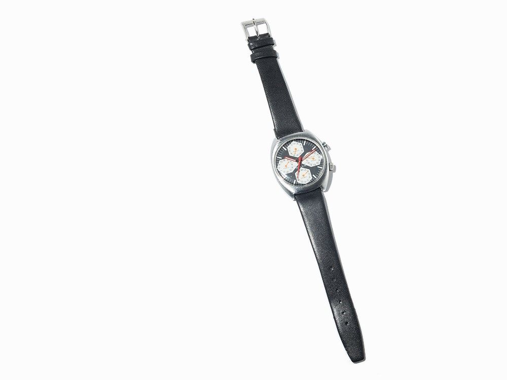 This present wristwatch was fabricated in the 1970s in Switzerland. It has a manual wind movement, and shows the hour, minute and central second. In addition, it displays the time in Paris, New York, Tokyo and Sydney. The black dial is fitted with white indices and sub-dials as well as red hands. The black leather strap has a pin buckle.