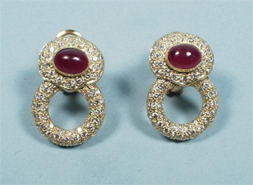 BULGARI - A pair of very good 18 kt. gold and diamond earrings. Each loop terminates in a diamond set ornament mounted by a fine cabochon red ruby. Fully marked. With original Bulgari suede pouch.